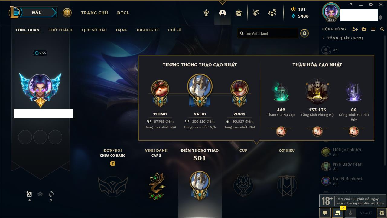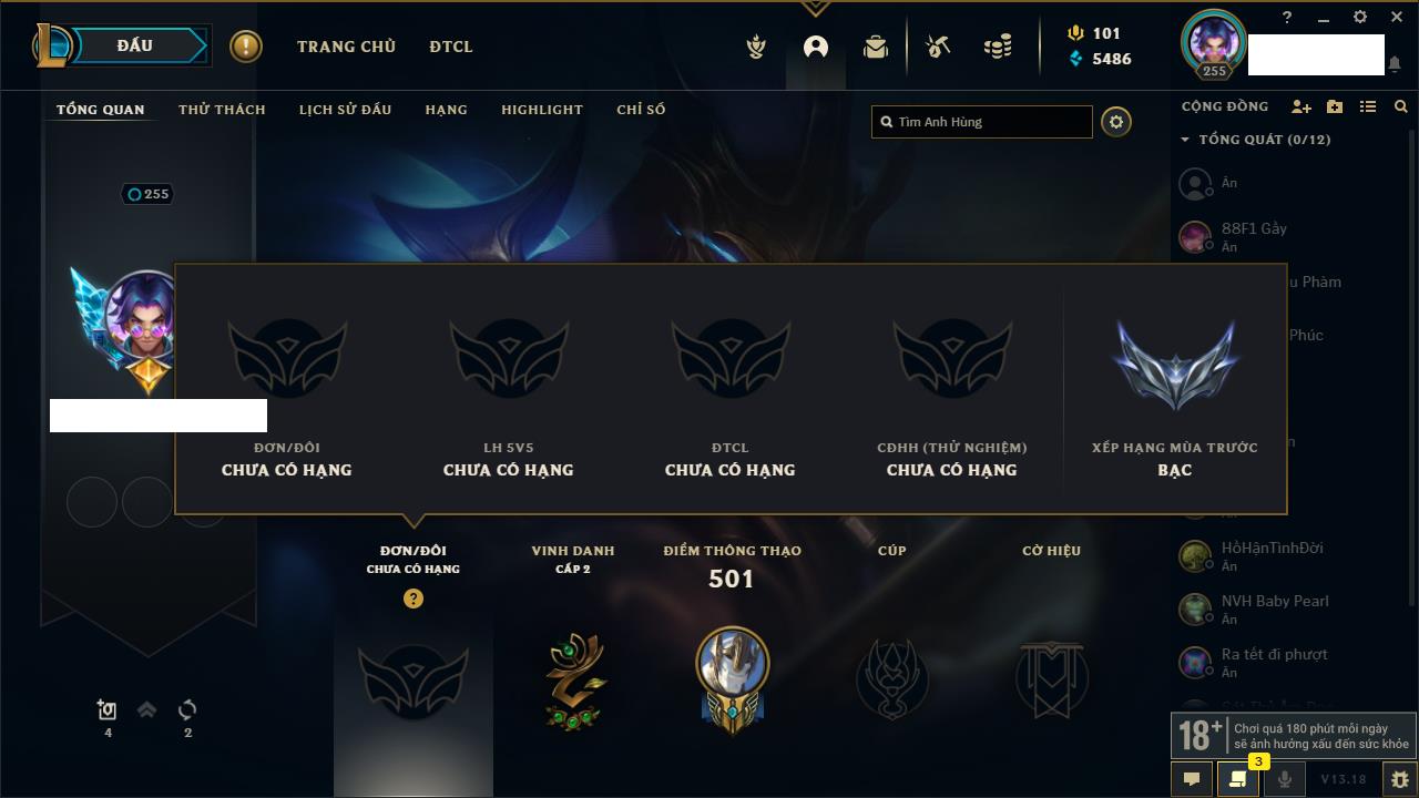 Rank Đơn: Vàng IIKhung: Bạch kimTướng: 172 - Còn 123420 THXTrang Phục: 231Rank ĐTCL: Bạch Kim IVLinh Thú: 213