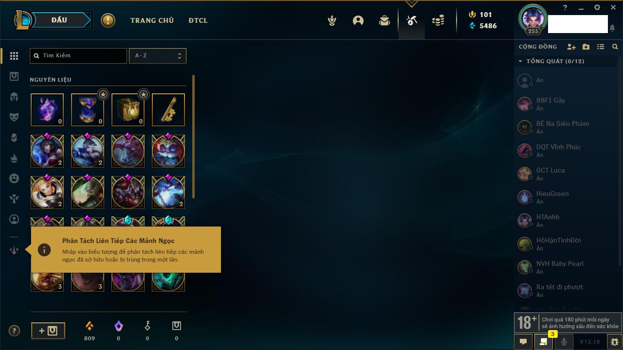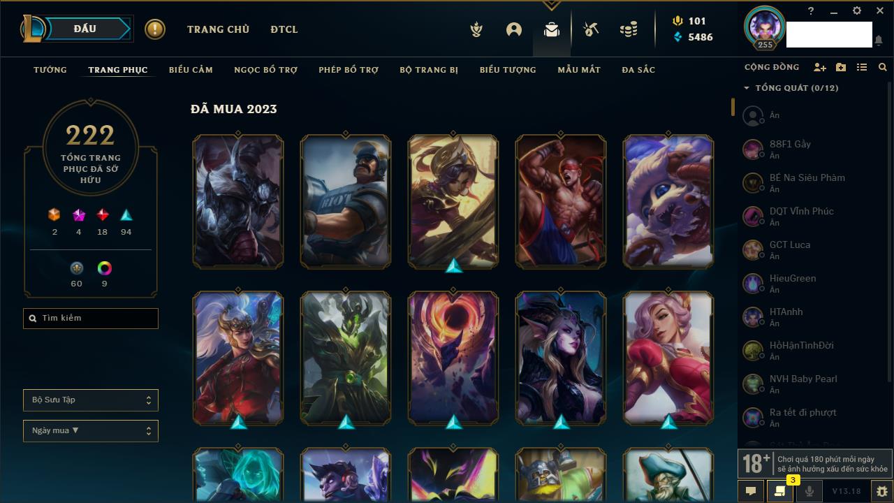 Rank Đơn: Vàng IIIKhung: VàngTướng: 172 - Còn 200315 THXTrang Phục: 87Rank ĐTCL: Chưa RankLinh Thú: 136