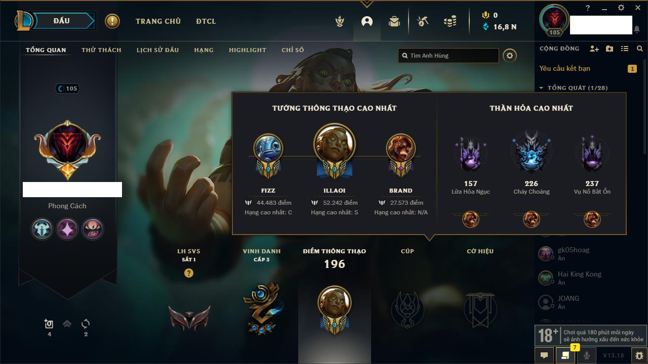 Rank Đơn: Chưa rank mùa nàoKhung: Chưa có khungTướng: 163 - Còn 970 THXTrang Phục: 16Rank ĐTCL: Chưa RankLinh Thú: 91