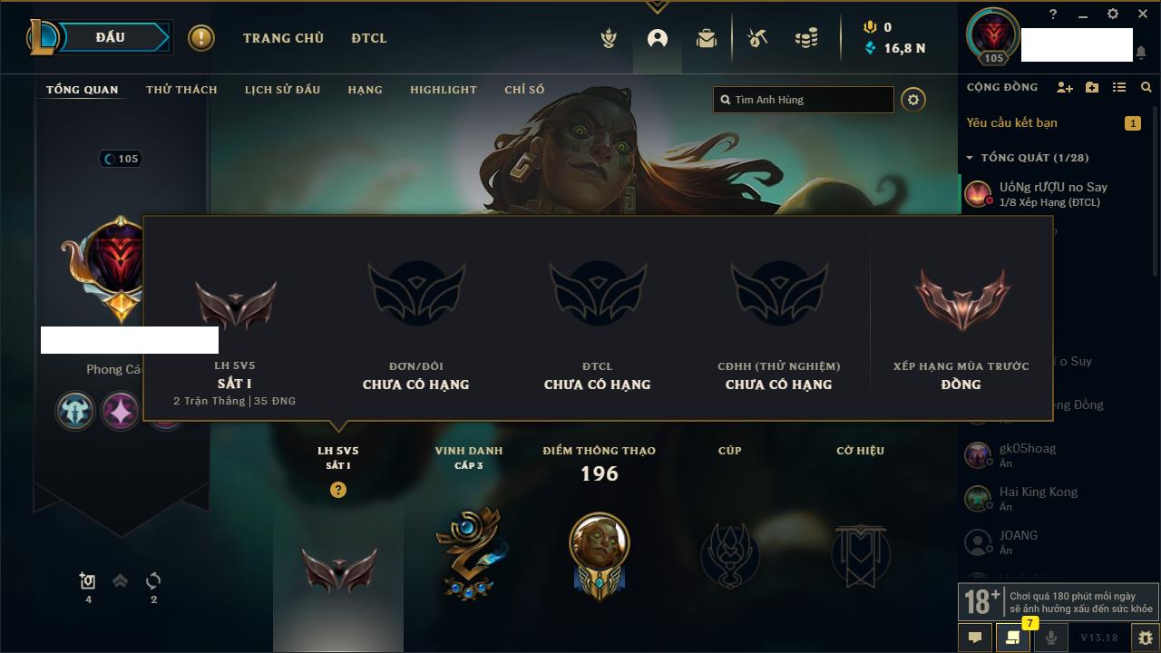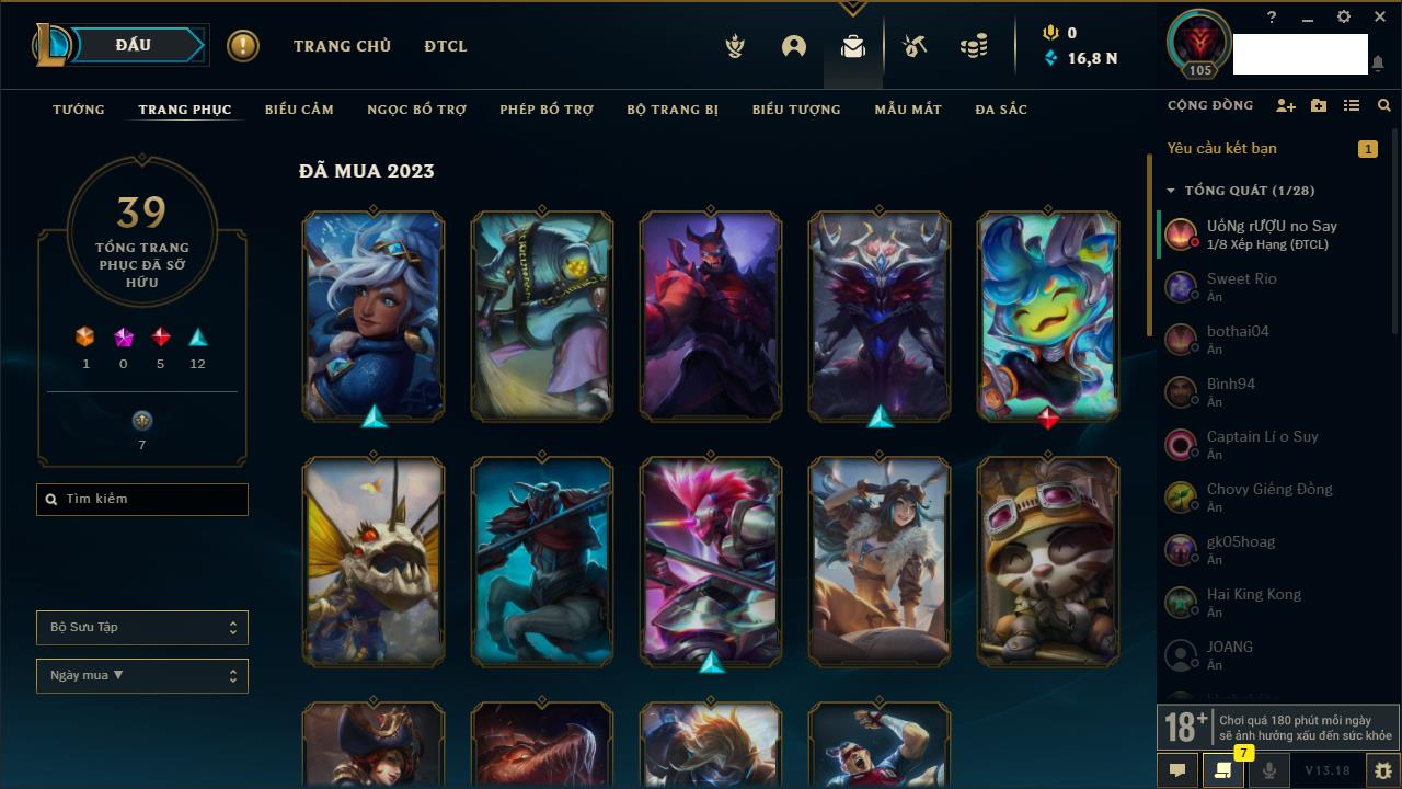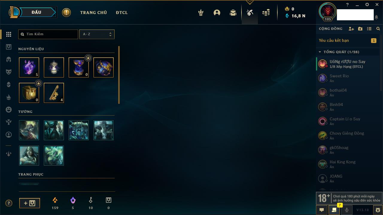 Rank Đơn: Chưa rank mùa nàoKhung: Chưa có khungTướng: 158 - Còn 6970 THXTrang Phục: 32Rank ĐTCL: Chưa RankLinh Thú: 24