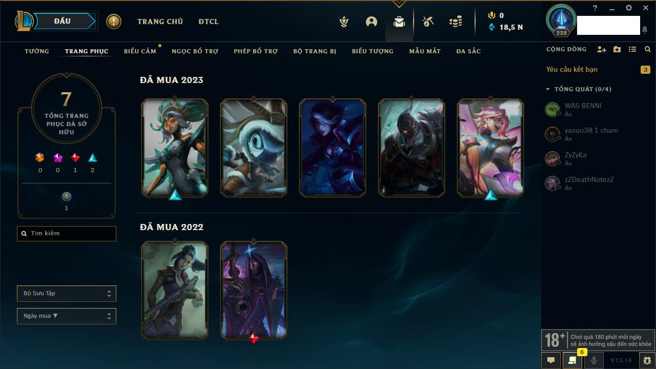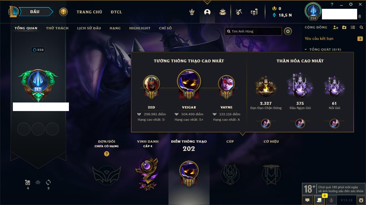 Rank Đơn: Chưa RankKhung: Chưa có khungTướng: 161 - Còn 7628 THXTrang Phục: 59Rank ĐTCL: Chưa RankLinh Thú: 39