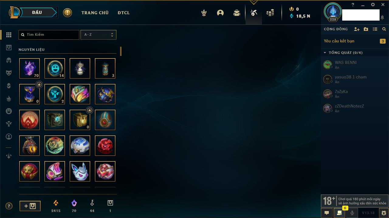 Rank Đơn: Chưa RankKhung: Chưa có khungTướng: 157 - Còn 6232 THXTrang Phục: 60Rank ĐTCL: Chưa RankLinh Thú: 89
