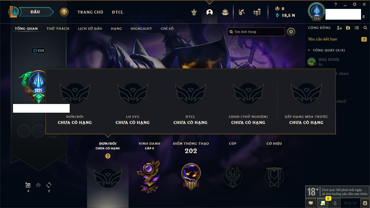 Rank Đơn: Chưa rank mùa nàoKhung: Chưa có khungTướng: 4 - Còn 30300 THXTrang Phục: 0Rank ĐTCL: Bạch Kim IVLinh Thú: 36