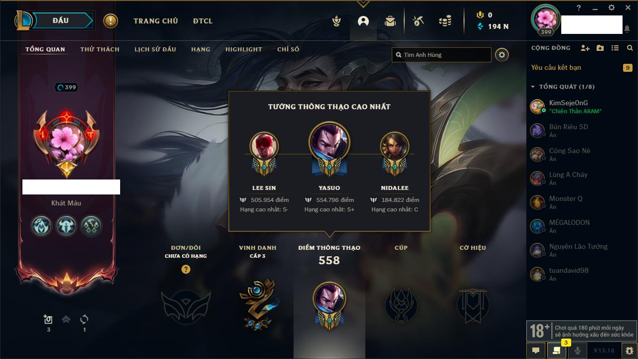 Rank Đơn: Bạch Kim IIIKhung: Bạch kimTướng: 170 - Còn 66107 THXTrang Phục: 201Rank ĐTCL: Chưa RankLinh Thú: 83