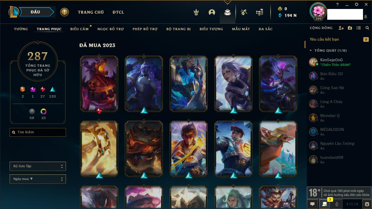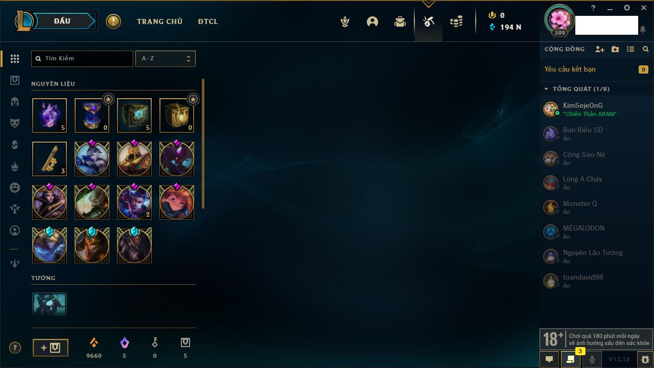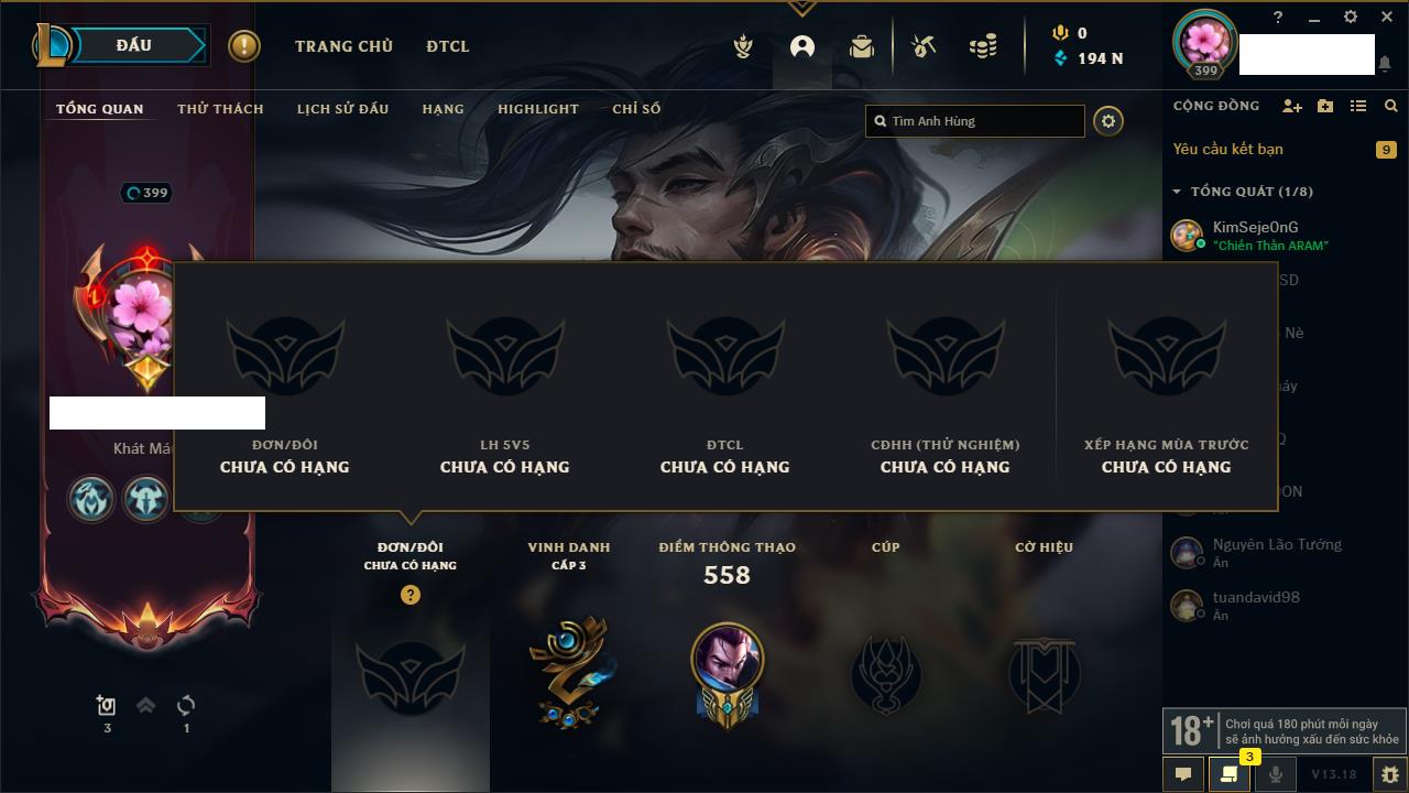 Rank Đơn: Vàng IIIKhung: Chưa có khungTướng: 171 - Còn 79750 THXTrang Phục: 288Rank ĐTCL: Chưa RankLinh Thú: 79