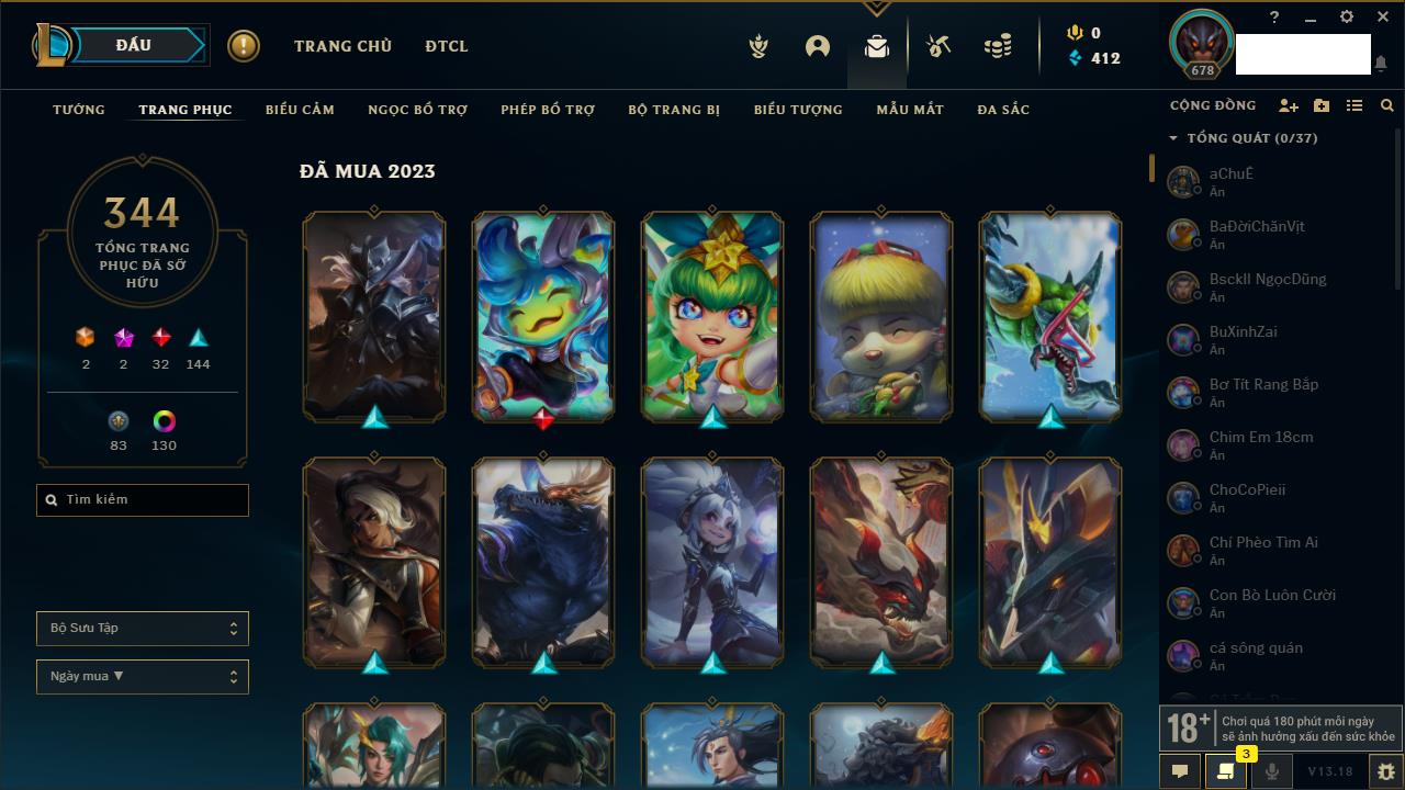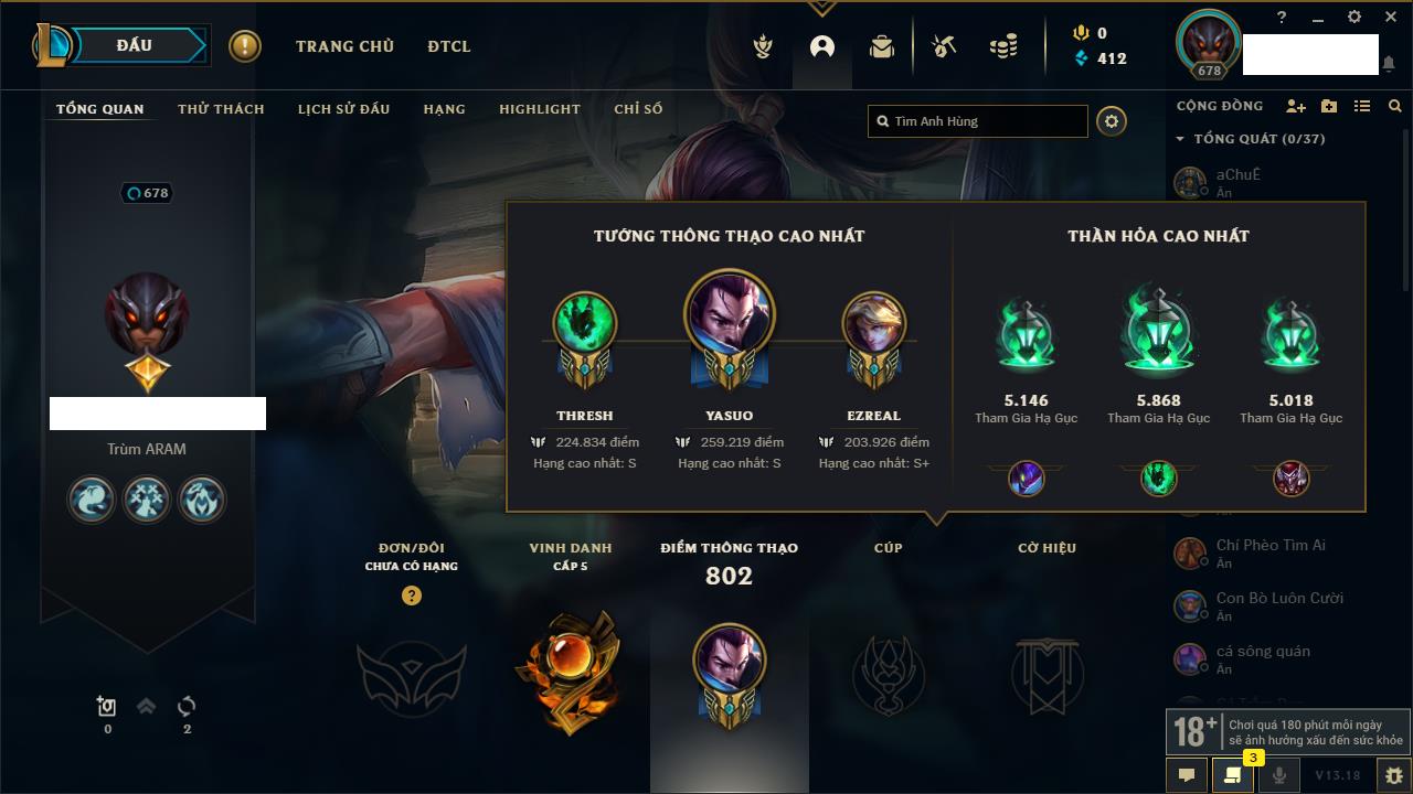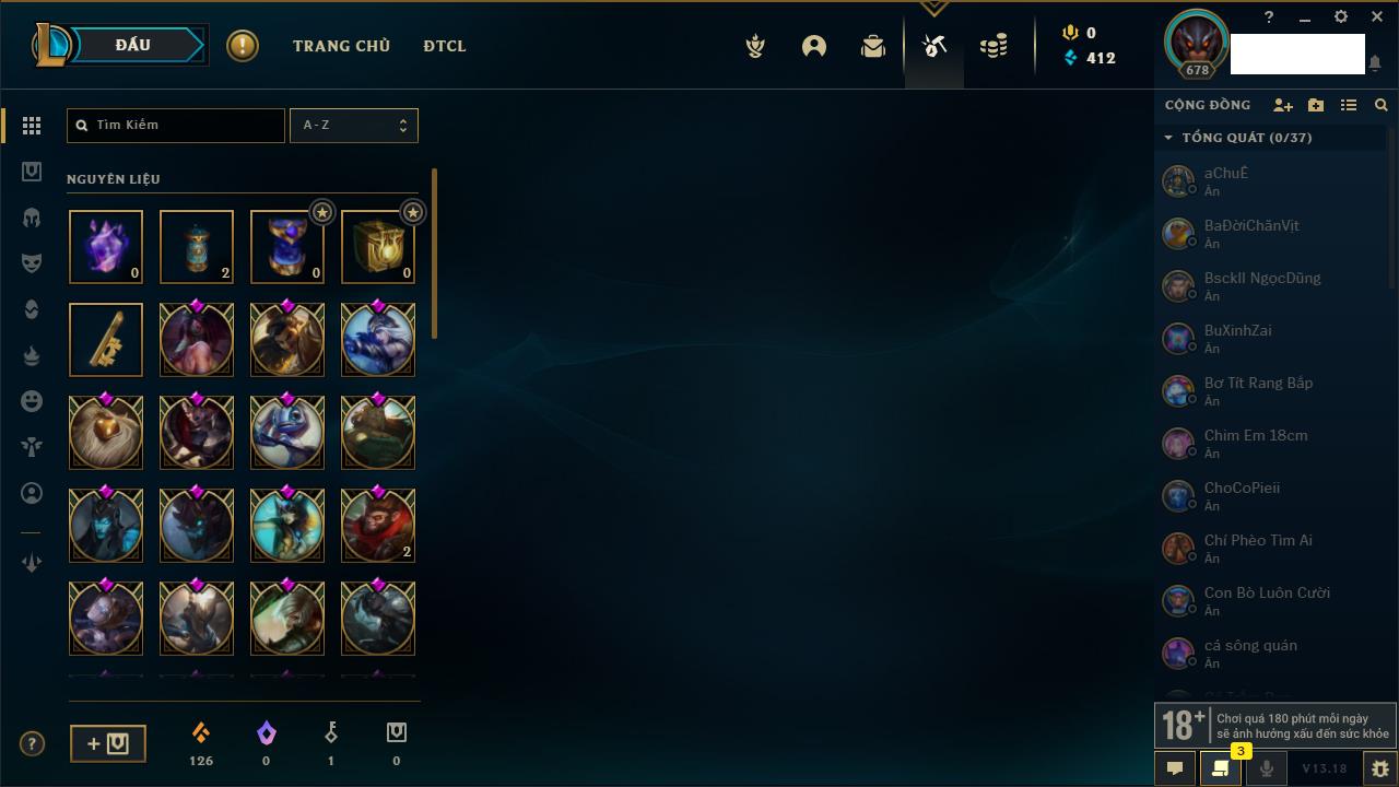 Rank Đơn: Bạch Kim IIKhung: Bạch kimTướng: 171 - Còn 316137 THXTrang Phục: 89Rank ĐTCL: Bạch Kim IIILinh Thú: 94