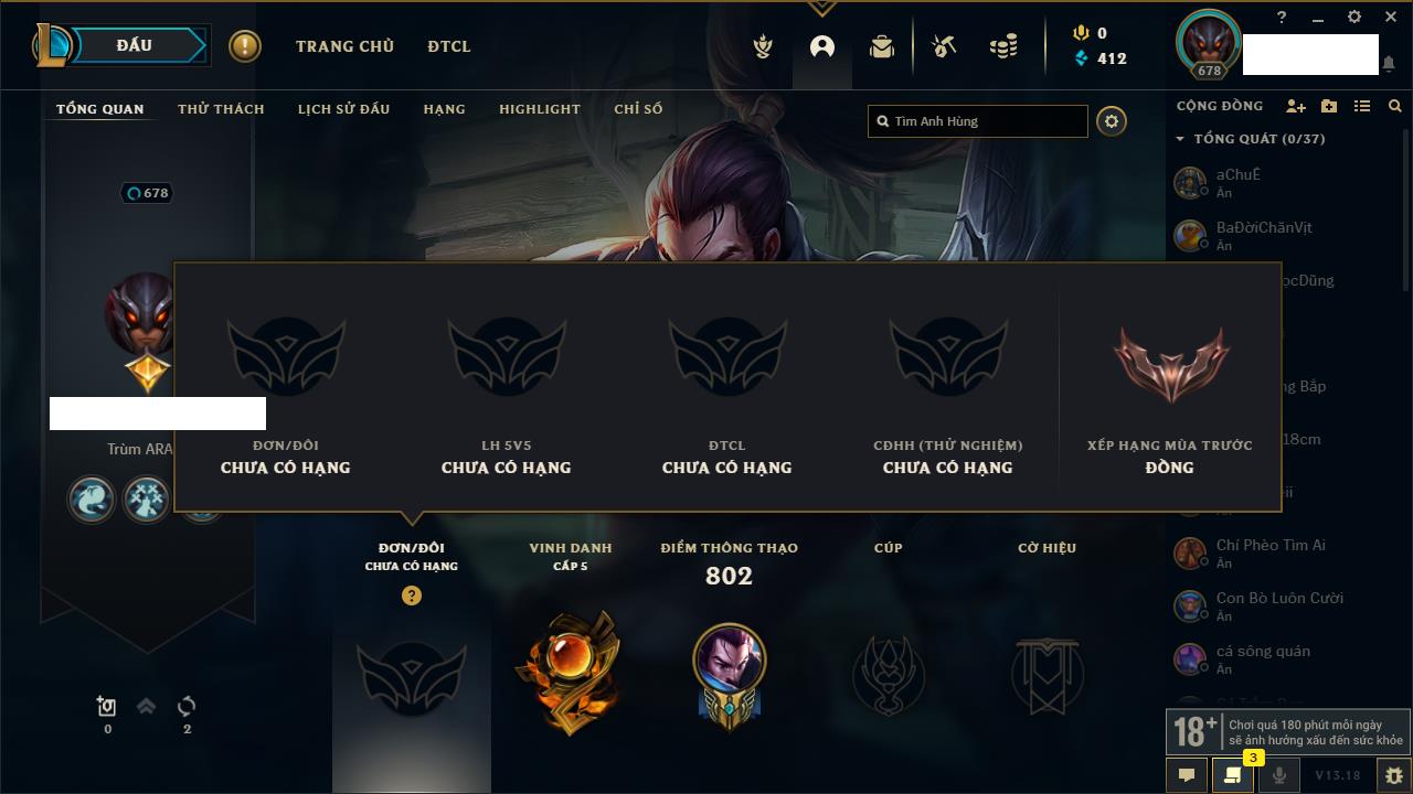 Rank Đơn: Lục Bảo IVKhung: VàngTướng: 171 - Còn 154648 THXTrang Phục: 203Rank ĐTCL: Bạch Kim IVLinh Thú: 69