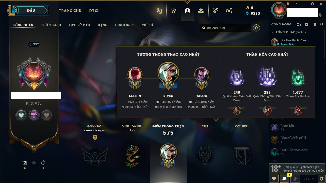 Rank Đơn: Bạc IIIKhung: Chưa có khungTướng: 171 - Còn 21493 THXTrang Phục: 252Rank ĐTCL: Bạch Kim IVLinh Thú: 123