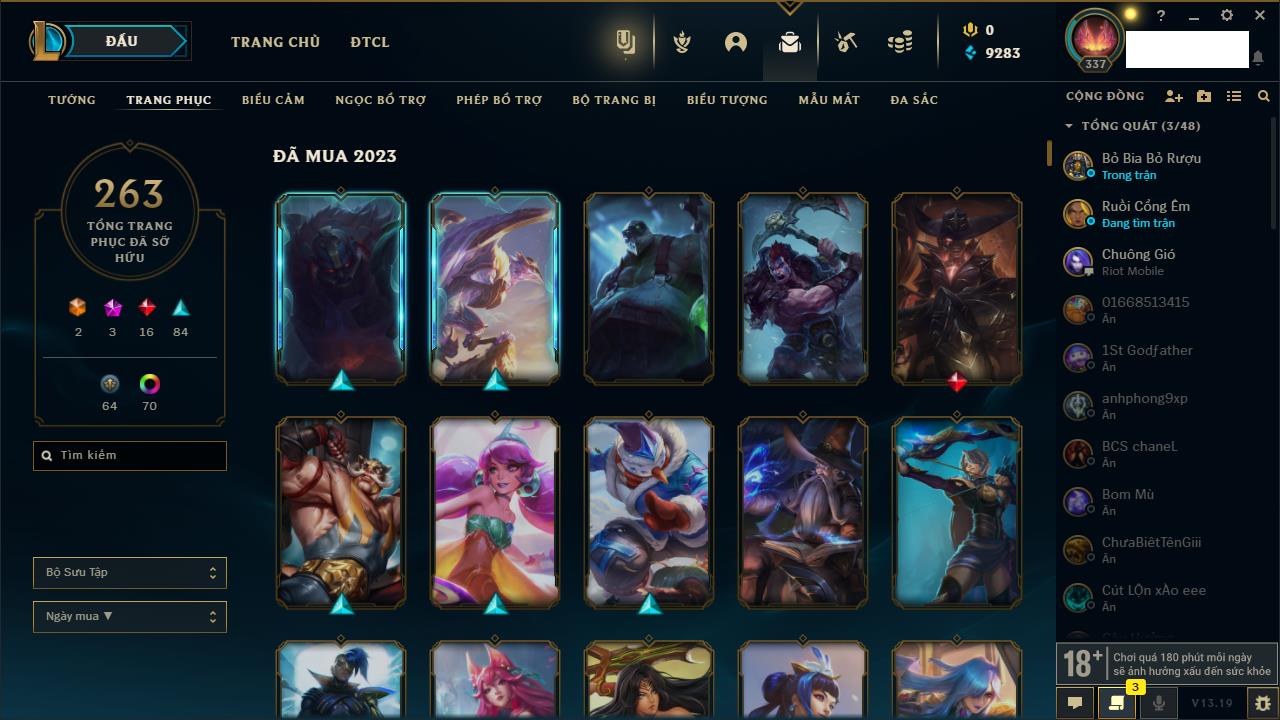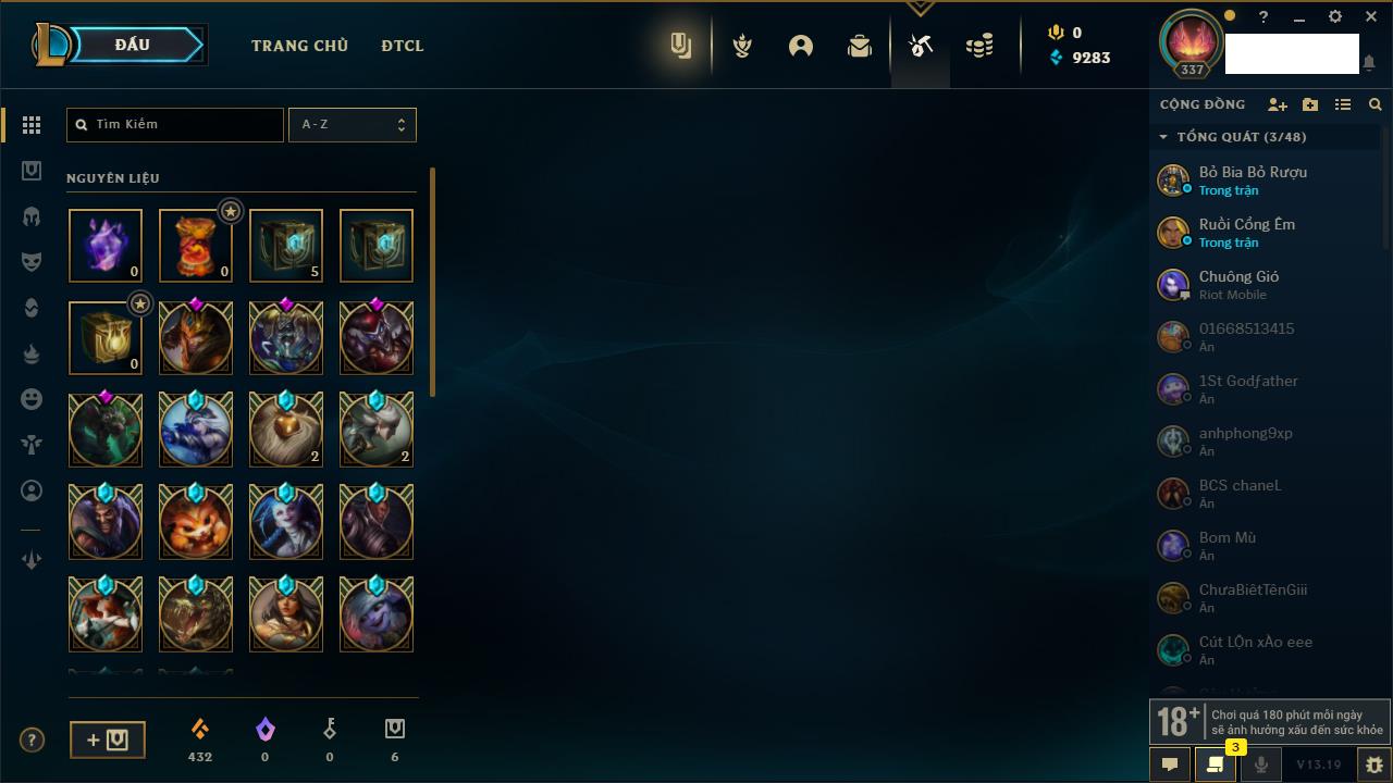 Rank Đơn: Vàng IIKhung: VàngTướng: 171 - Còn 34018 THXTrang Phục: 250Rank ĐTCL: Sắt IILinh Thú: 19