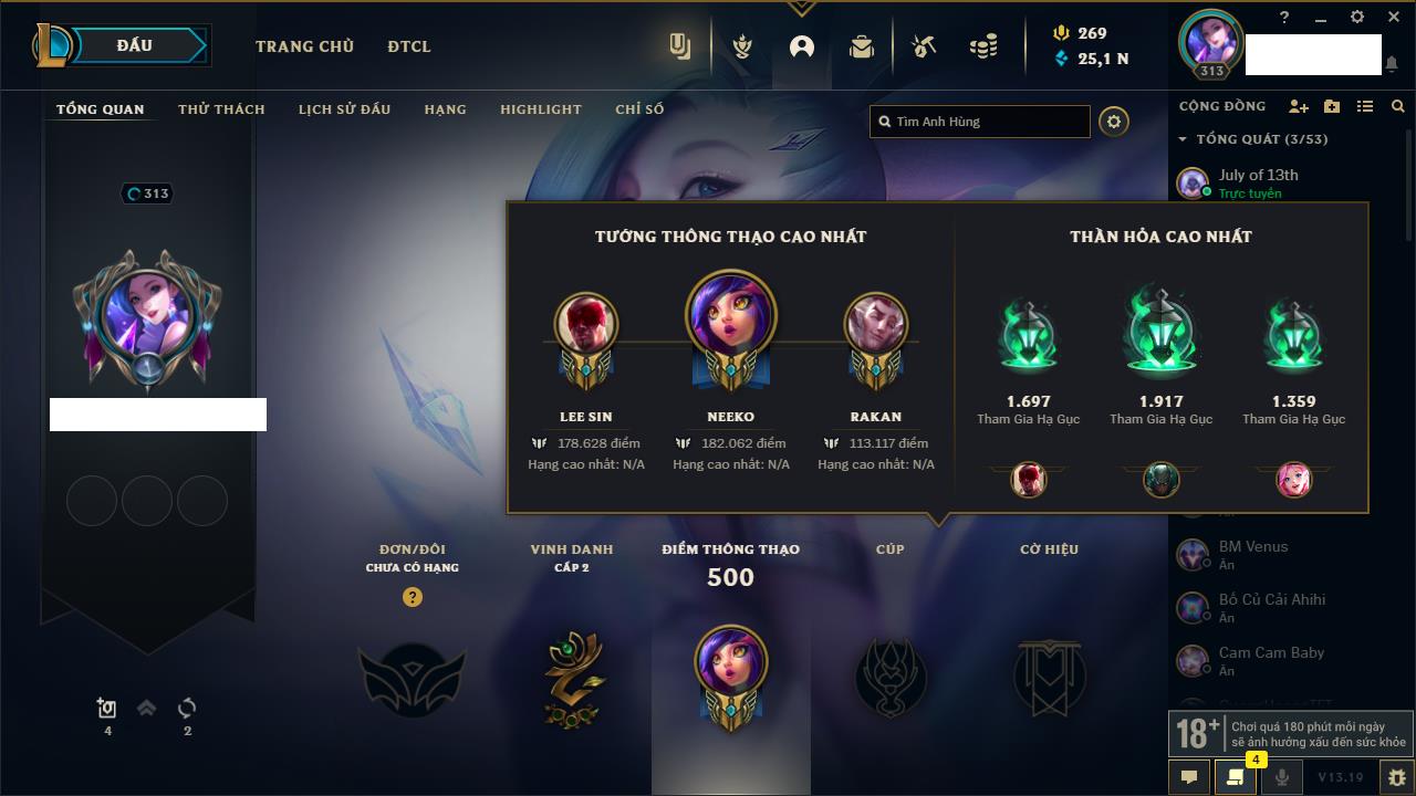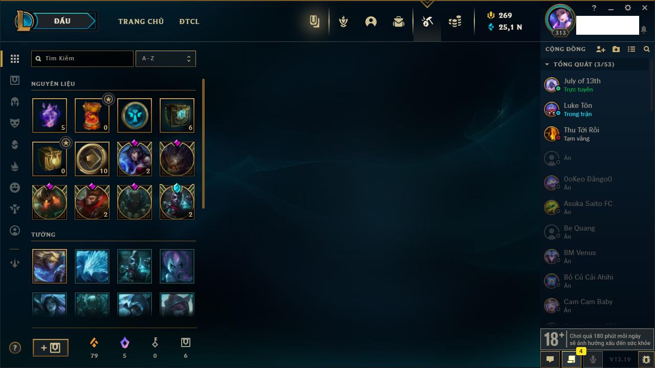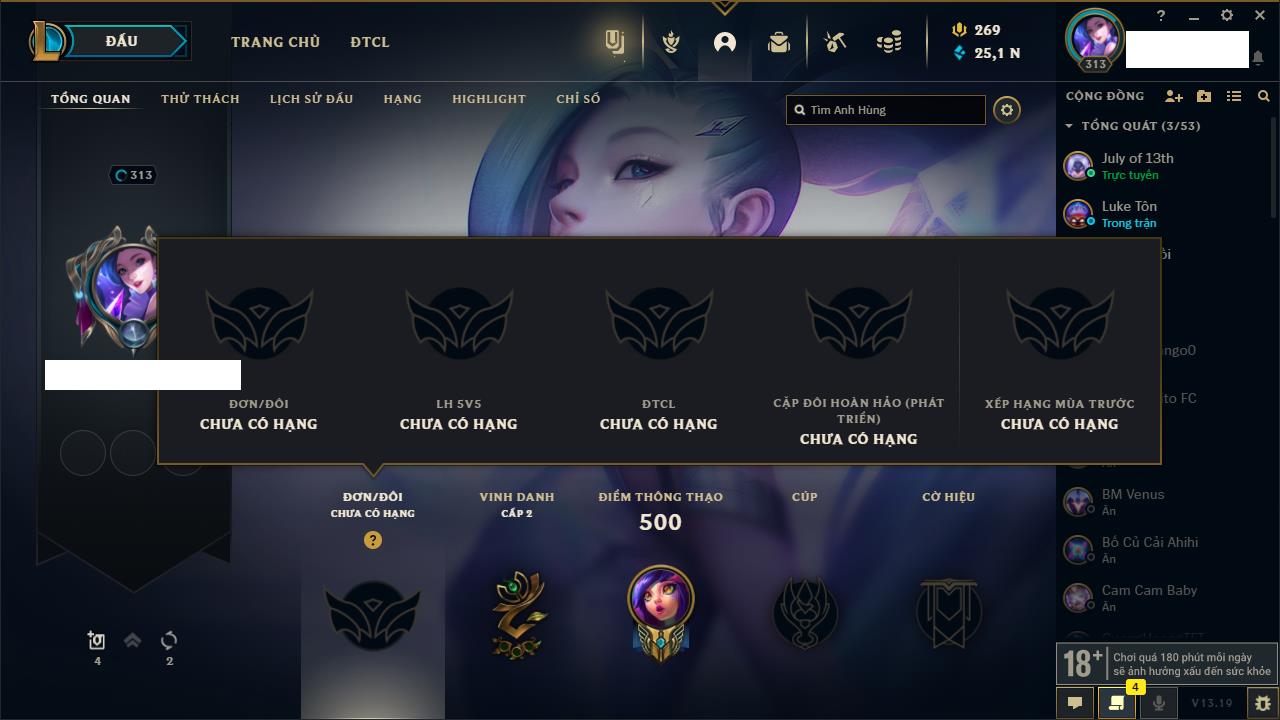 Rank Đơn: Bạc IIIKhung: BạcTướng: 171 - Còn 51045 THXTrang Phục: 220Rank ĐTCL: Sắt IILinh Thú: 141