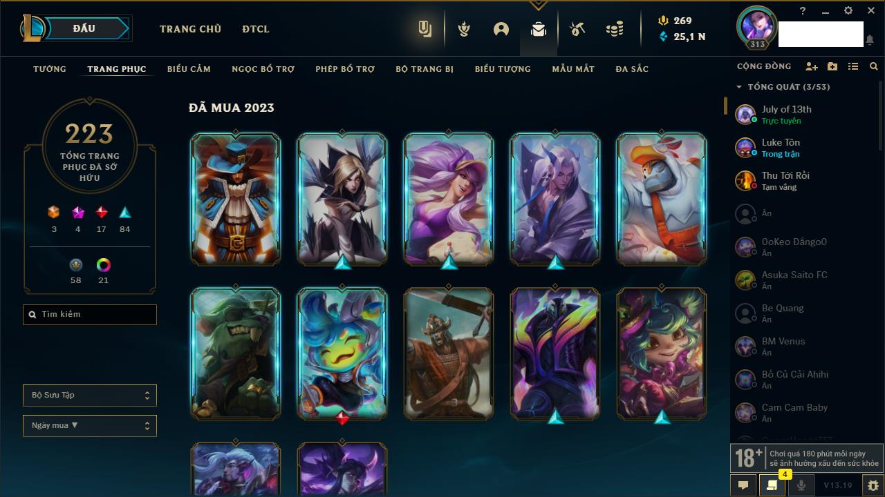 Rank Đơn: Vàng IKhung: VàngTướng: 171 - Còn 117995 THXTrang Phục: 199Rank ĐTCL: Lục Bảo IILinh Thú: 74