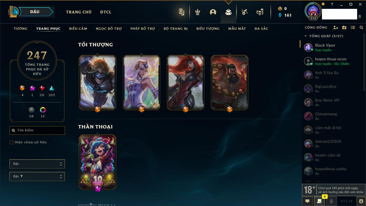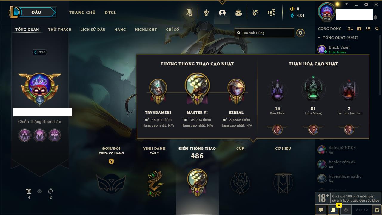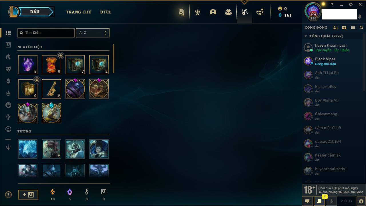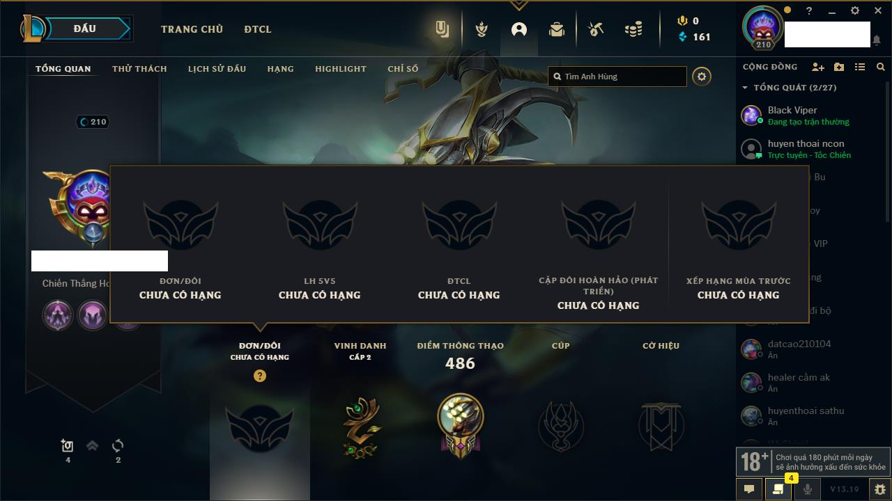 Rank Đơn: Vàng IIIKhung: BạcTướng: 171 - Còn 101359 THXTrang Phục: 88Rank ĐTCL: Kim Cương IVLinh Thú: 200