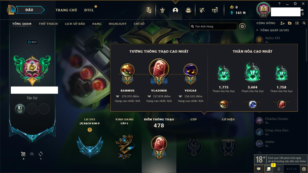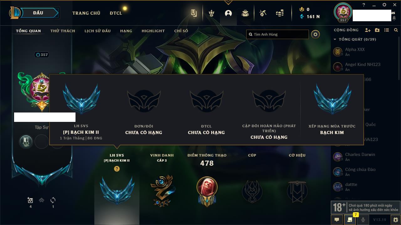 Rank Đơn: Bạch Kim IIKhung: VàngTướng: 171 - Còn 140736 THXTrang Phục: 182Rank ĐTCL: Chưa RankLinh Thú: 14