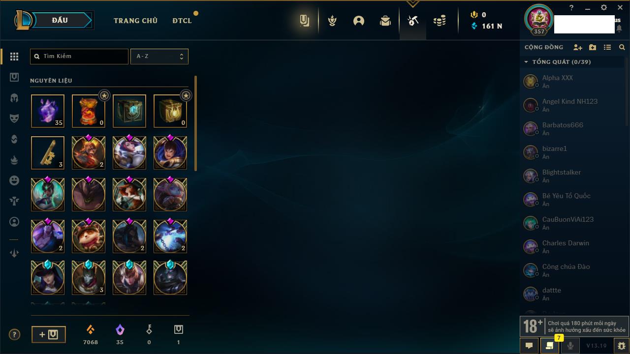 Rank Đơn: Vàng IVKhung: VàngTướng: 170 - Còn 84355 THXTrang Phục: 199Rank ĐTCL: Chưa RankLinh Thú: 116