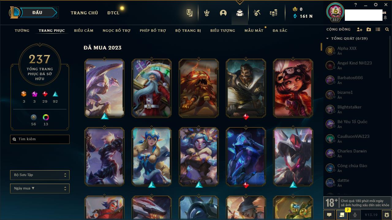 Rank Đơn: Bạc IIIKhung: BạcTướng: 171 - Còn 51045 THXTrang Phục: 220Rank ĐTCL: Sắt IILinh Thú: 141