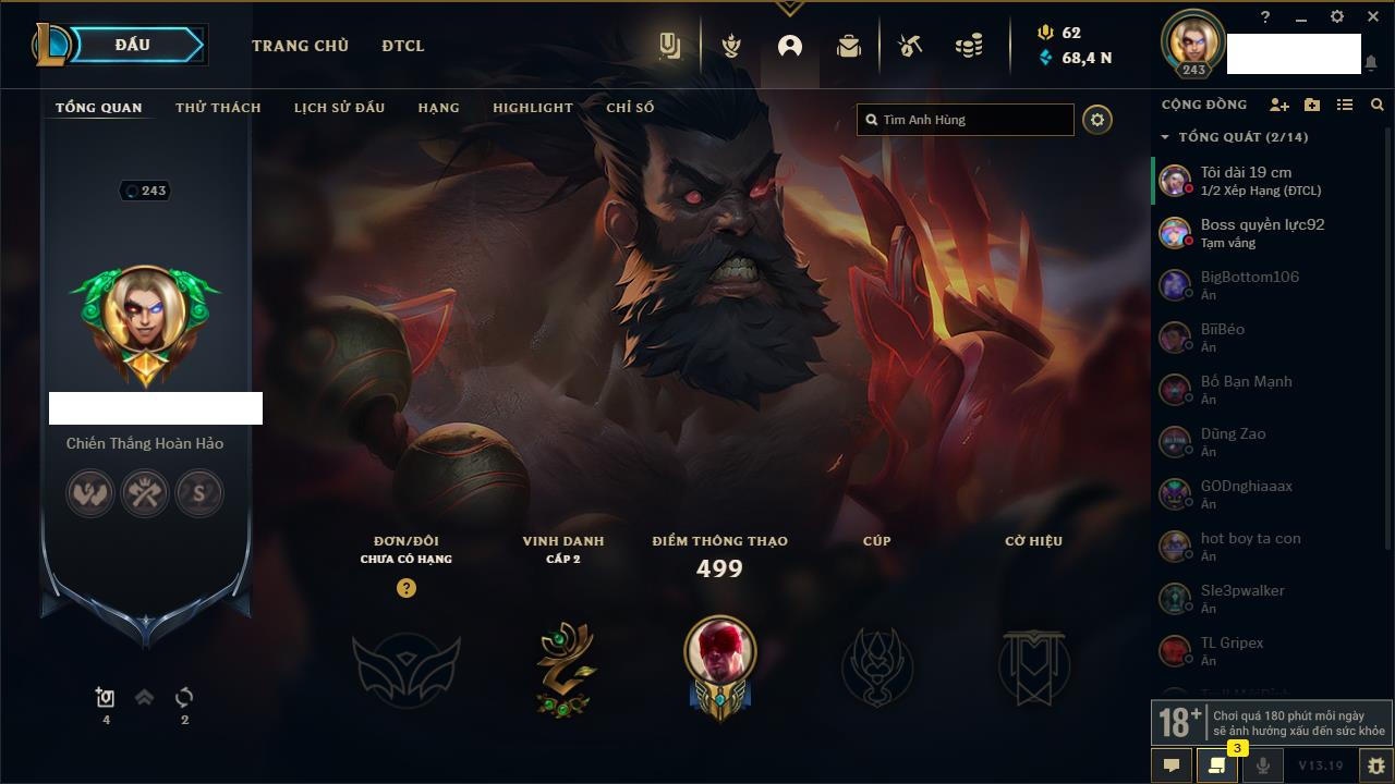 Rank Đơn: Bạch Kim IIKhung: Bạch kimTướng: 171 - Còn 316137 THXTrang Phục: 89Rank ĐTCL: Bạch Kim IIILinh Thú: 94