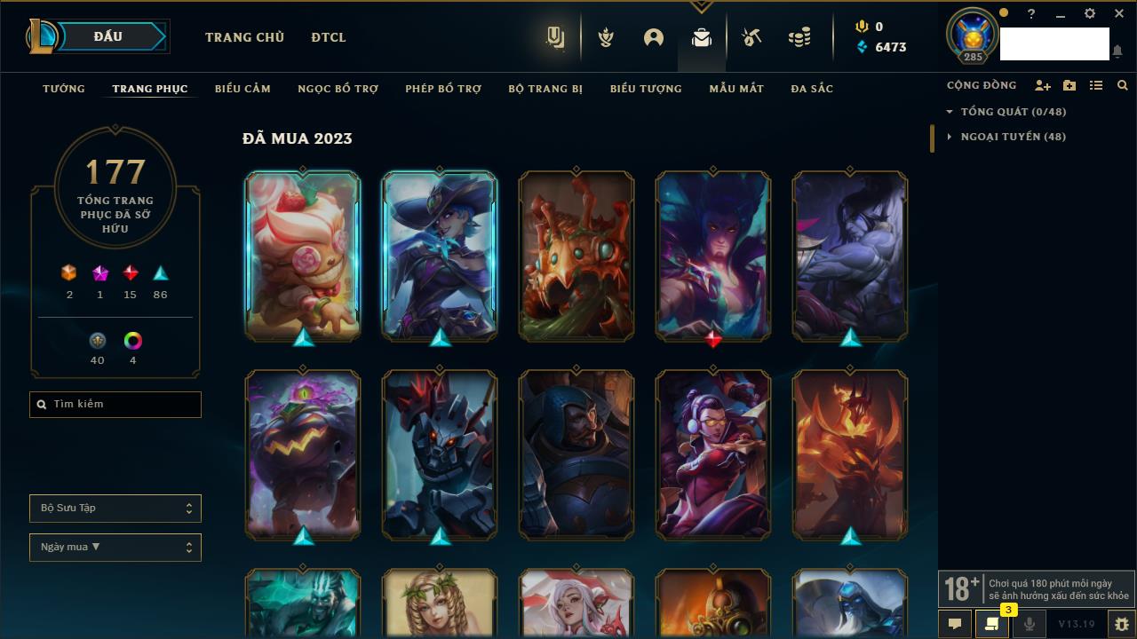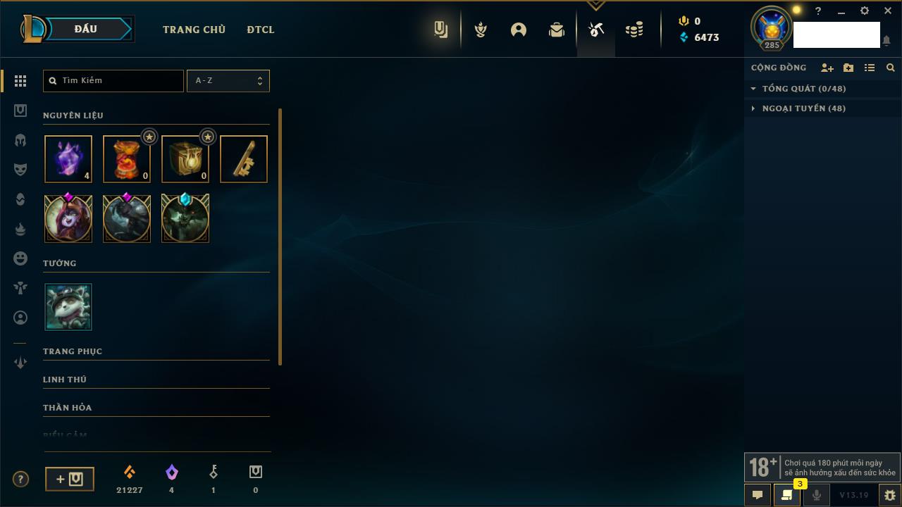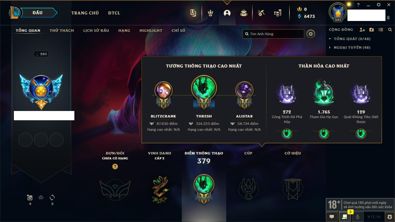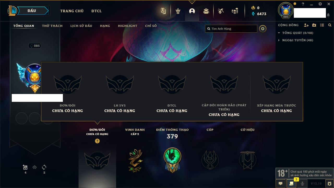 Rank Đơn: Đồng IIKhung: Chưa có khungTướng: 170 - Còn 56487 THXTrang Phục: 90Rank ĐTCL: Chưa RankLinh Thú: 129