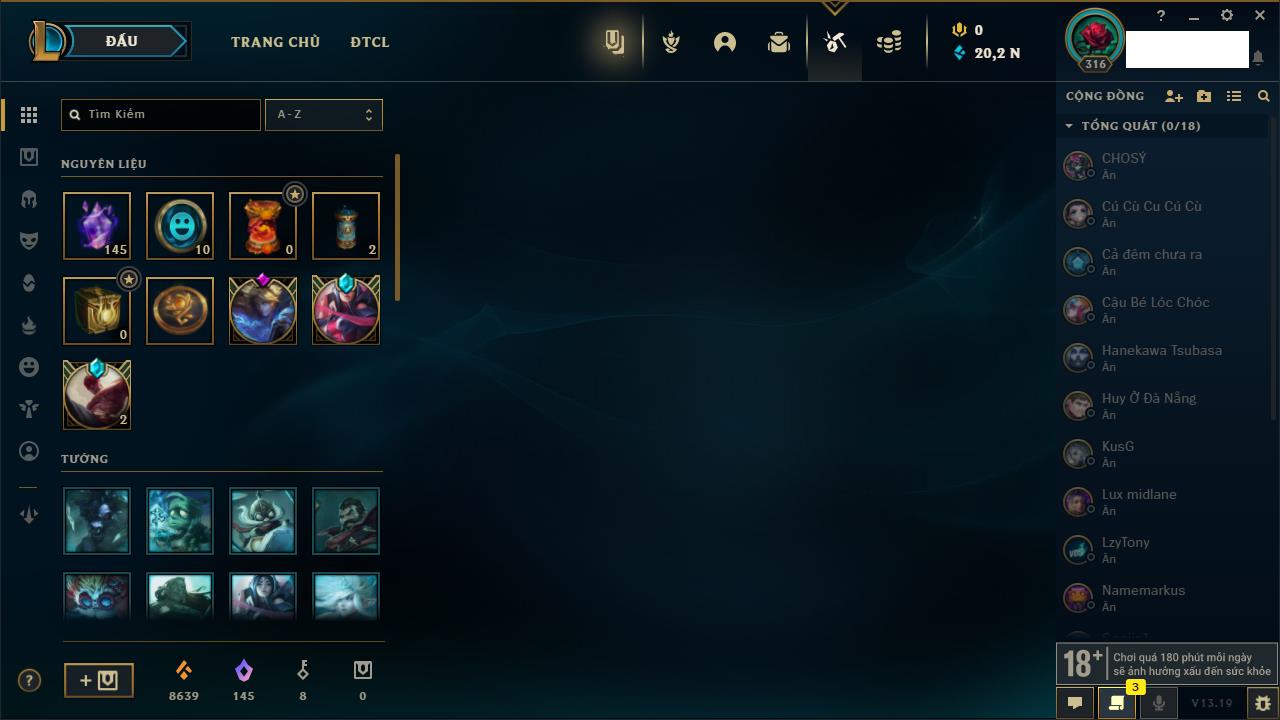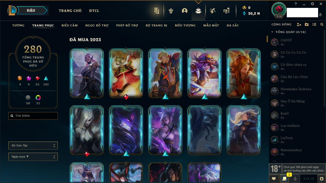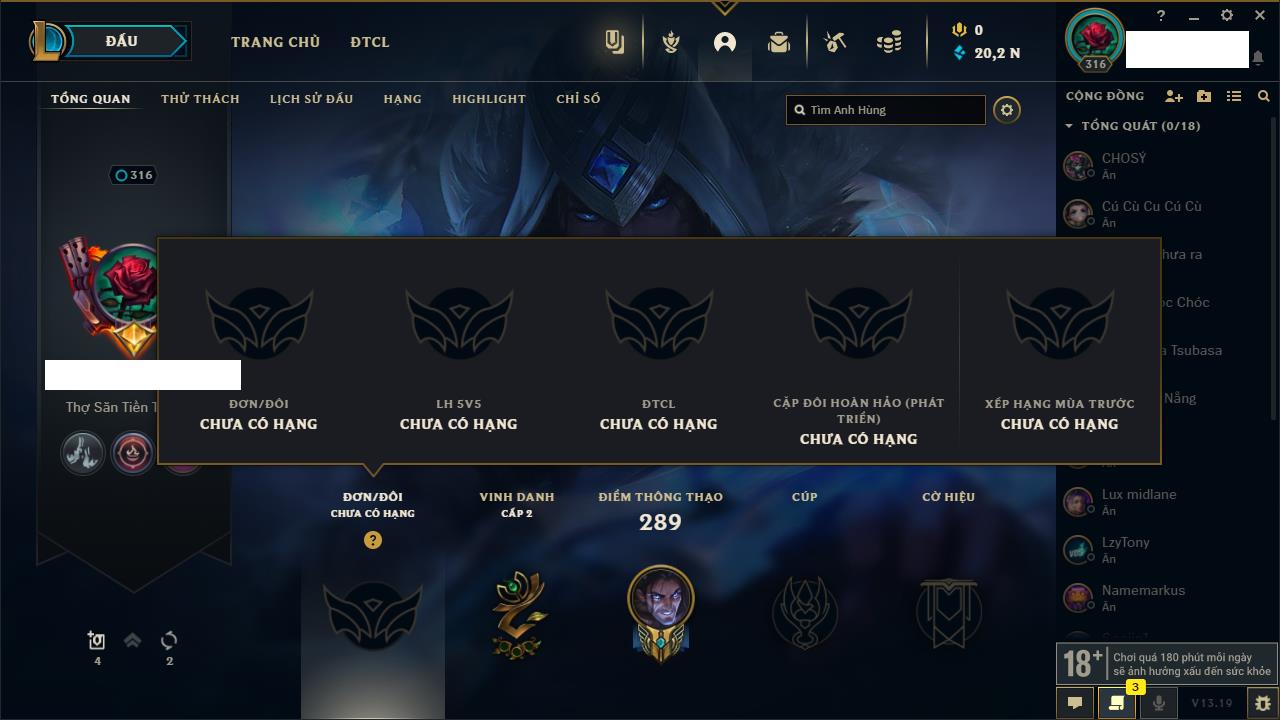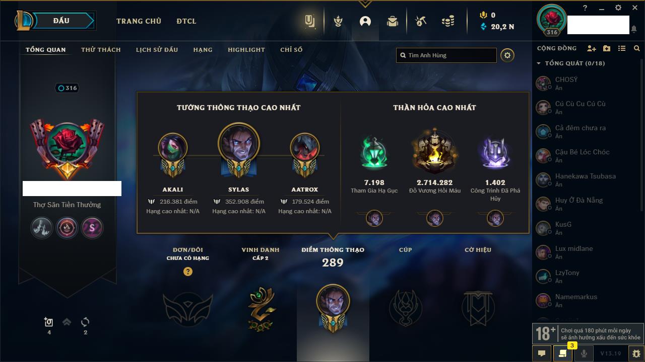 Rank Đơn: Vàng IKhung: Bạch kimTướng: 170 - Còn 212450 THXTrang Phục: 214Rank ĐTCL: Bạch Kim IVLinh Thú: 221