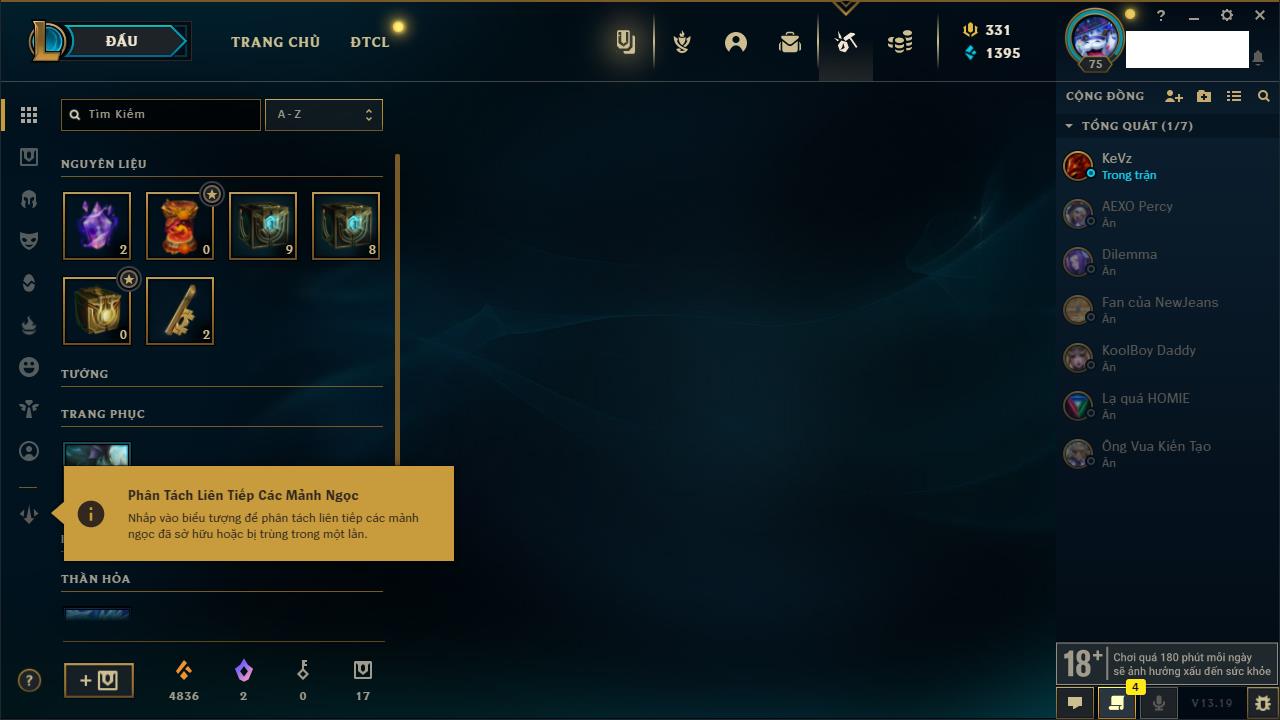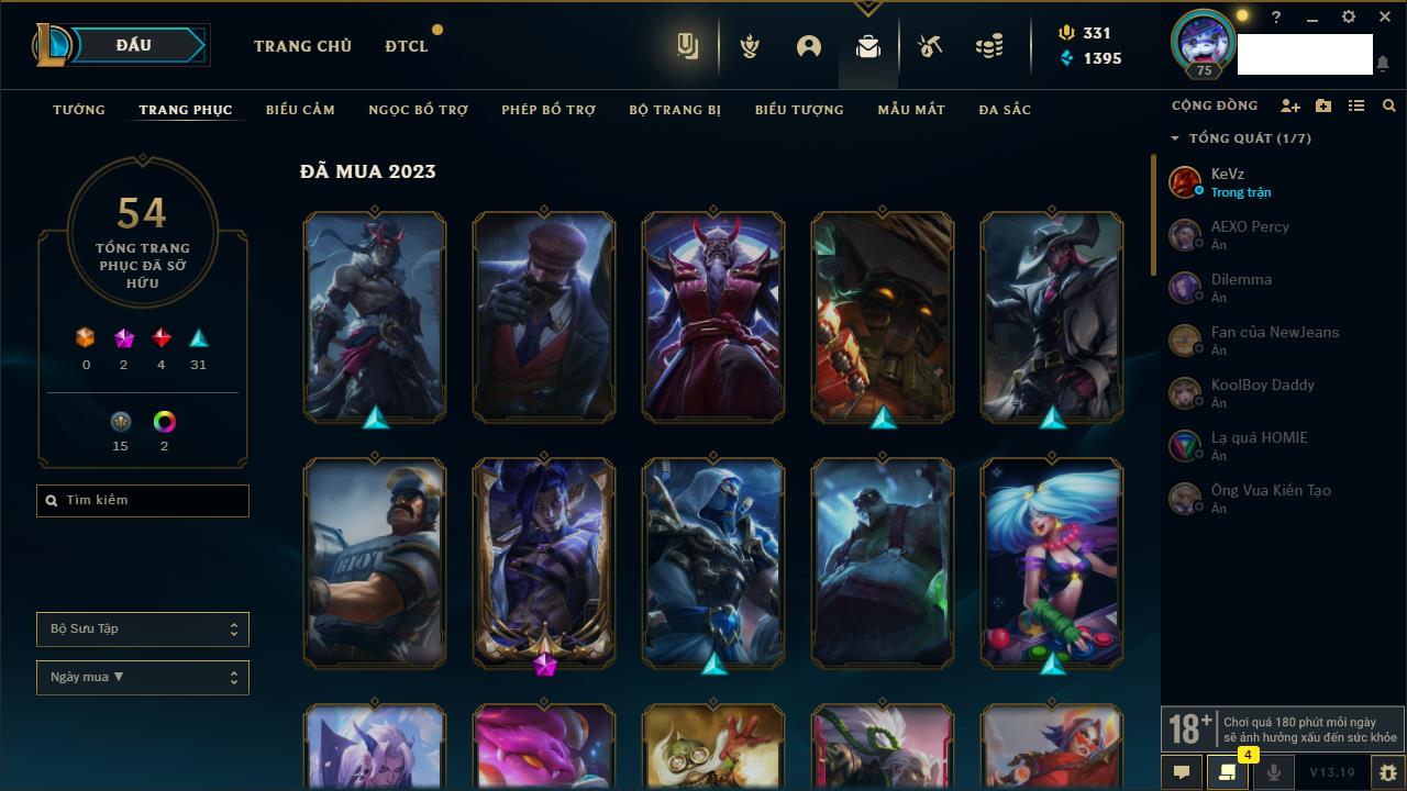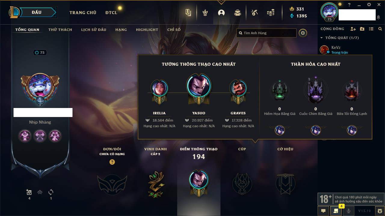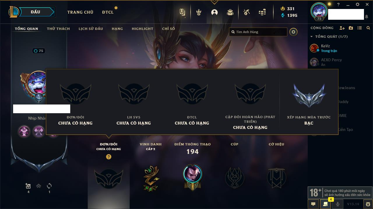 Rank Đơn: Vàng IIIKhung: BạcTướng: 171 - Còn 101359 THXTrang Phục: 88Rank ĐTCL: Kim Cương IVLinh Thú: 200