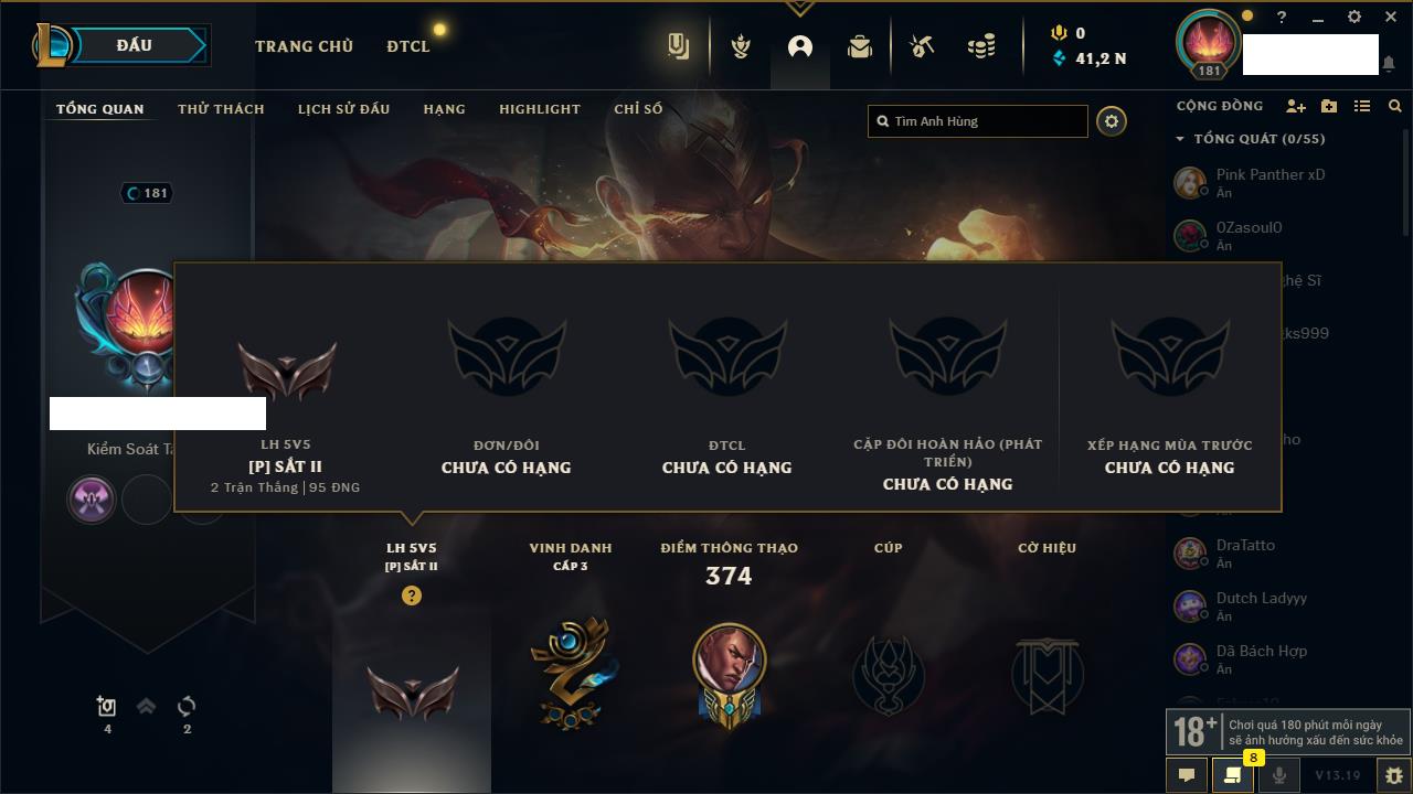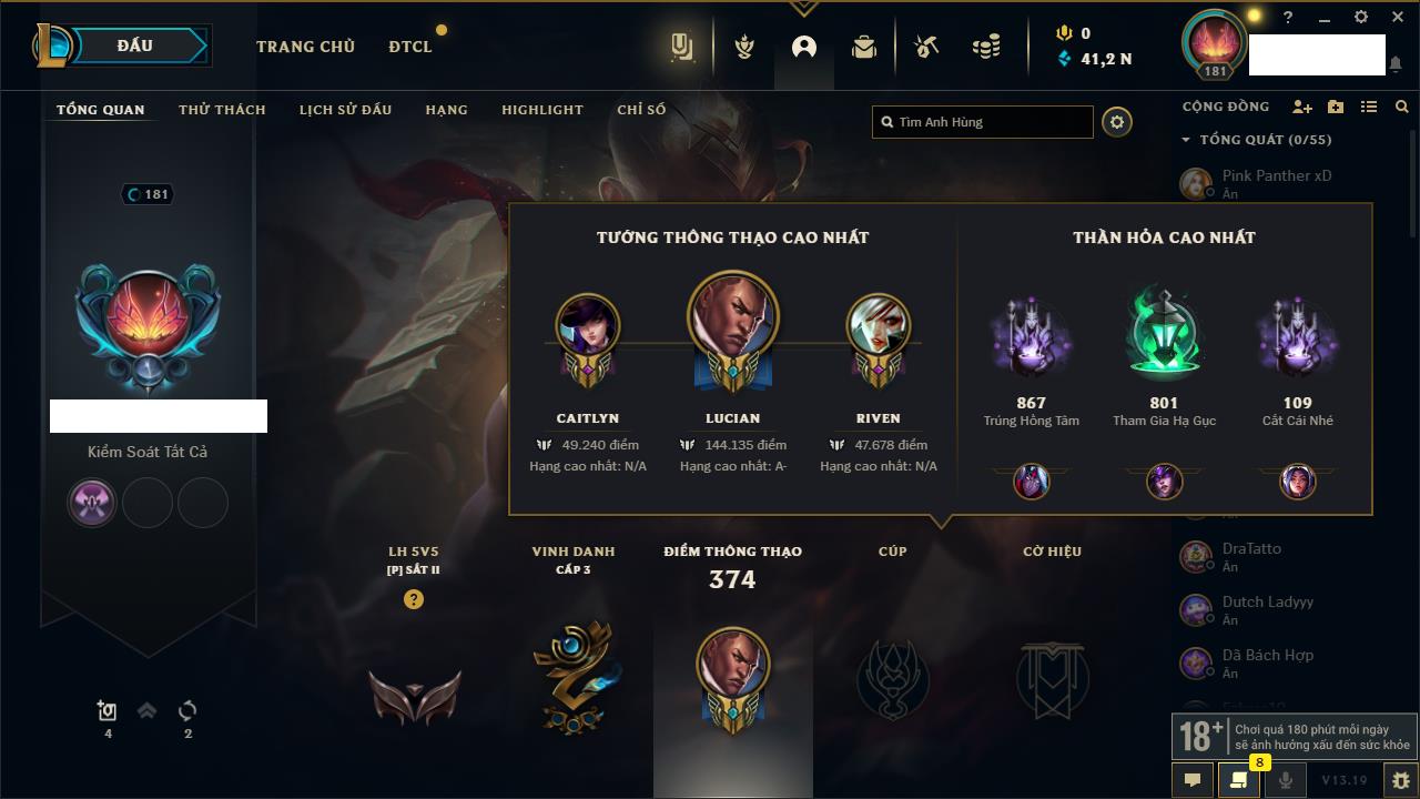 Rank Đơn: Chưa RankKhung: Chưa có khungTướng: 65 - Còn 2075 THXTrang Phục: 10Rank ĐTCL: Chưa RankLinh Thú: 72