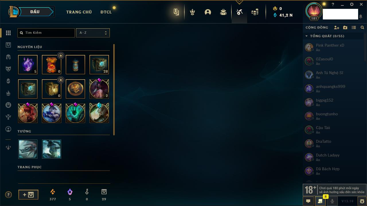 Rank Đơn: Chưa RankKhung: Chưa có khungTướng: 170 - Còn 13795 THXTrang Phục: 75Rank ĐTCL: Chưa RankLinh Thú: 176
