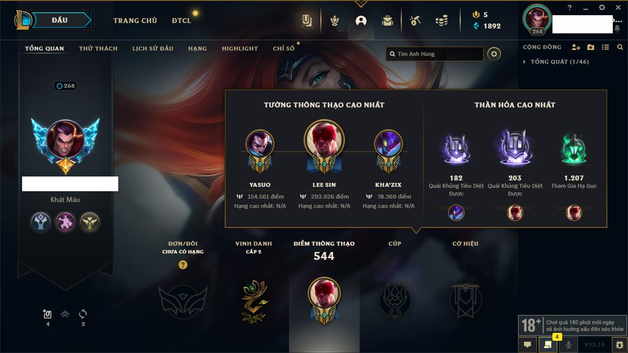 Rank Đơn: Chưa RankKhung: Chưa có khungTướng: 157 - Còn 6783 THXTrang Phục: 50Rank ĐTCL: Chưa RankLinh Thú: 37