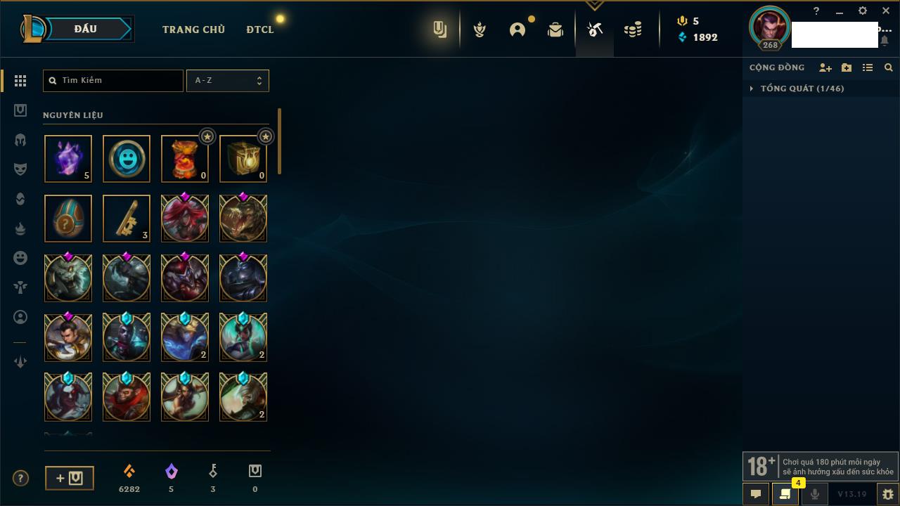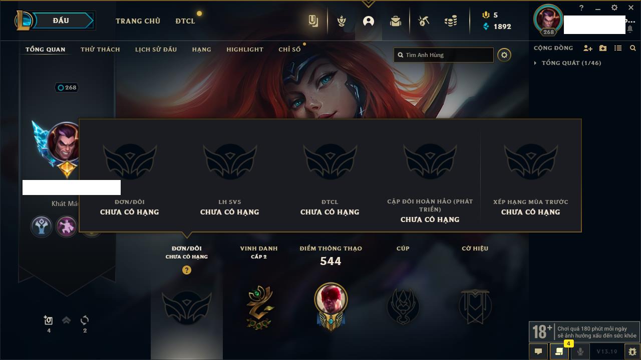 Rank Đơn: Vàng IVKhung: VàngTướng: 146 - Còn 89110 THXTrang Phục: 63Rank ĐTCL: Vàng IIILinh Thú: 41