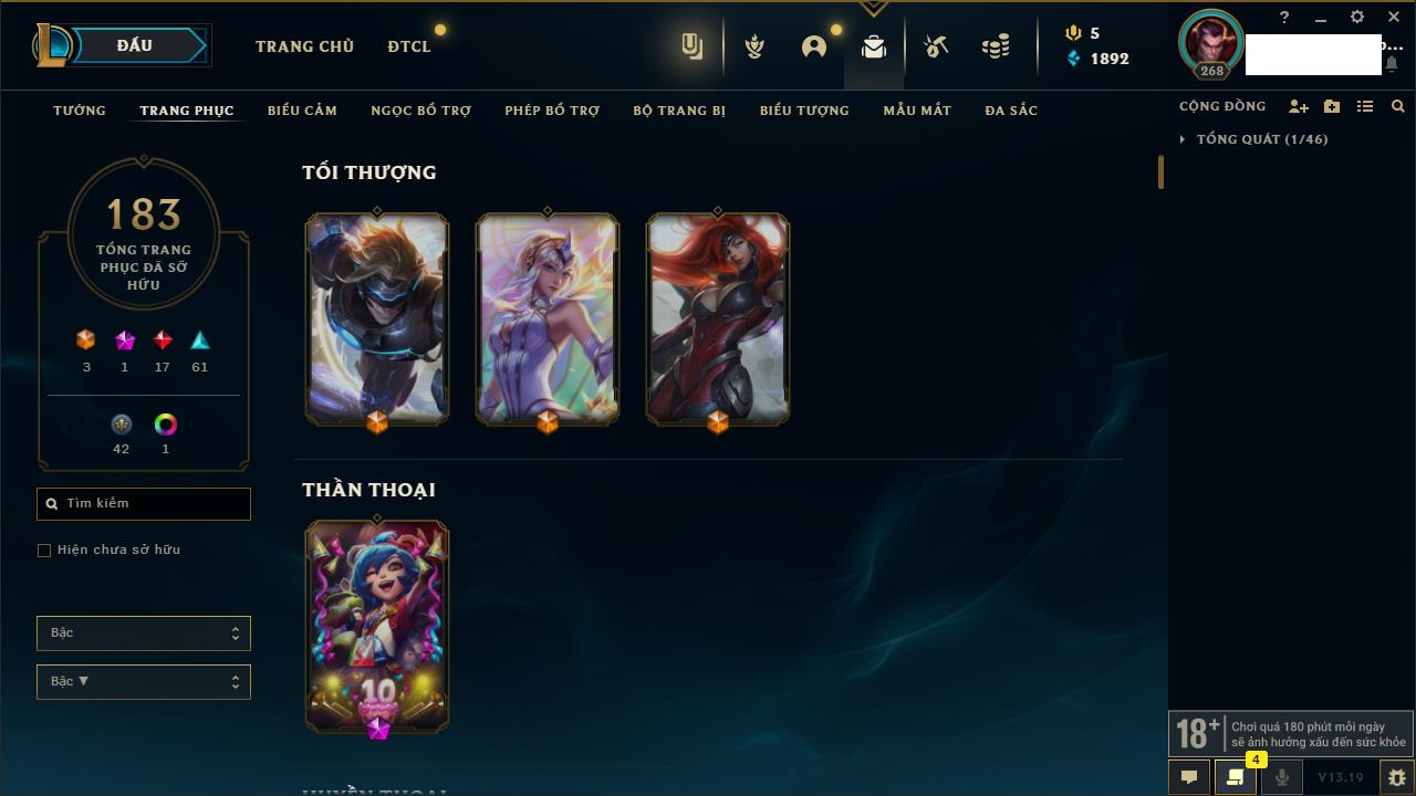 Rank Đơn: Đồng IIKhung: Chưa có khungTướng: 170 - Còn 56487 THXTrang Phục: 90Rank ĐTCL: Chưa RankLinh Thú: 129