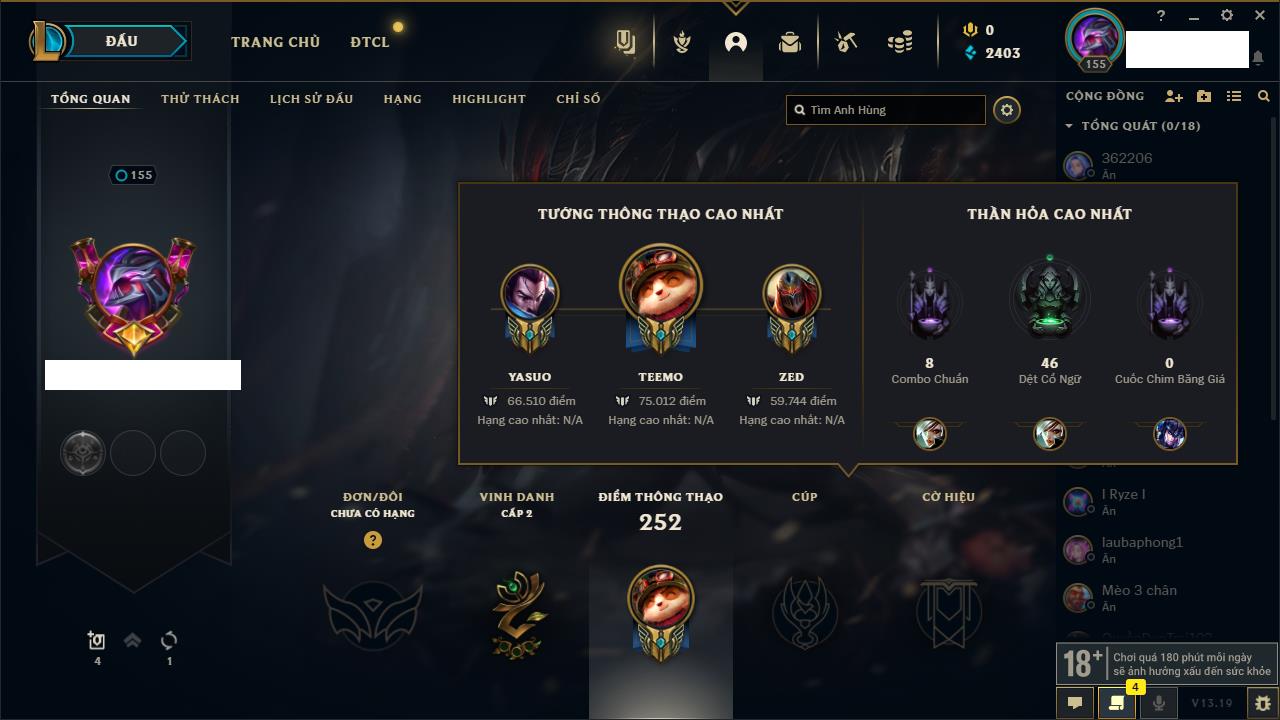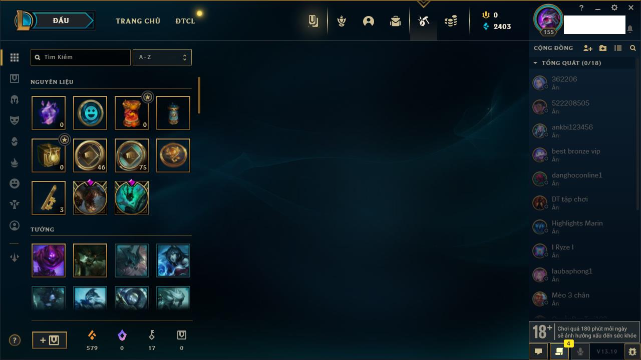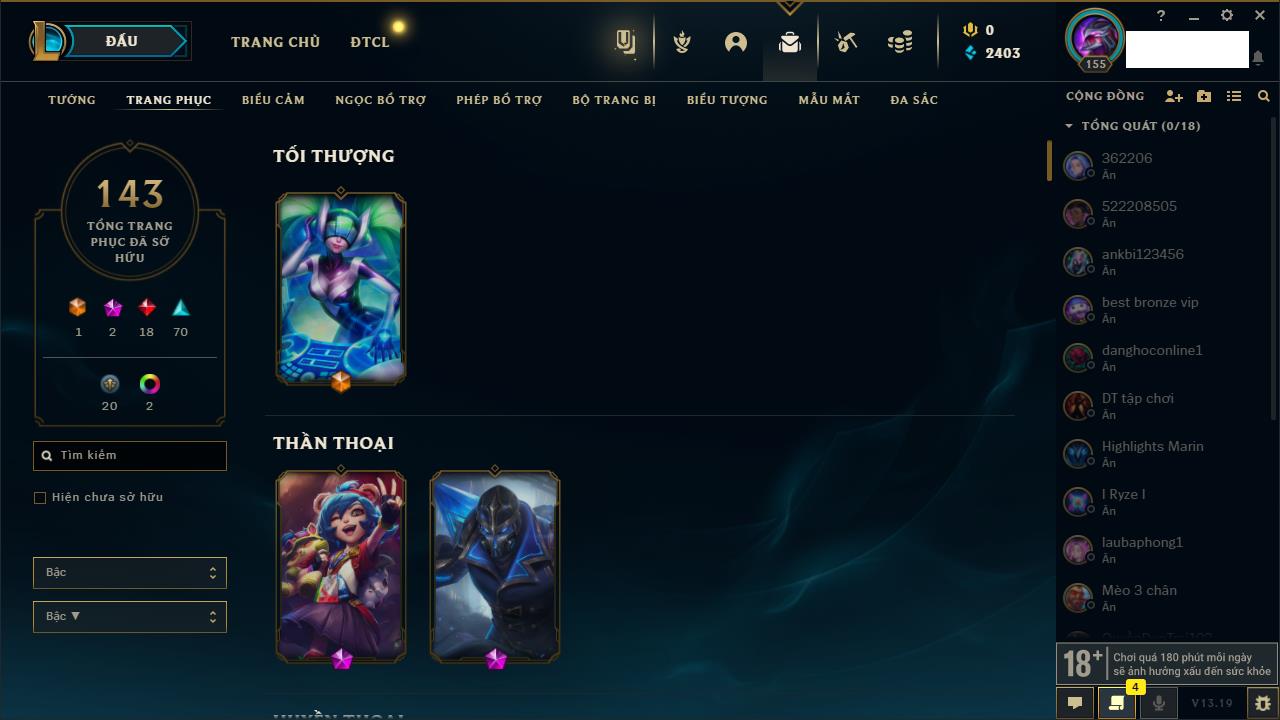 Rank Đơn: Chưa RankKhung: Chưa có khungTướng: 163 - Còn 157403 THXTrang Phục: 149Rank ĐTCL: Chưa RankLinh Thú: 122