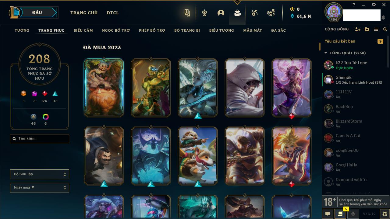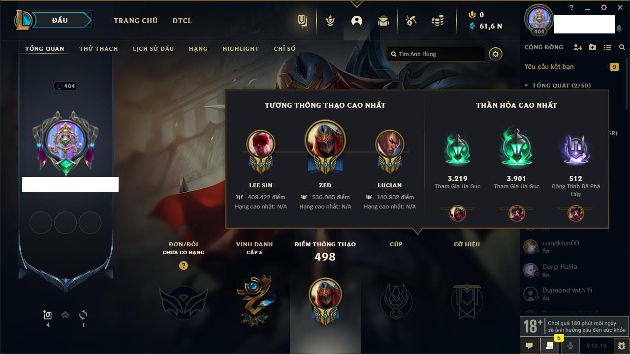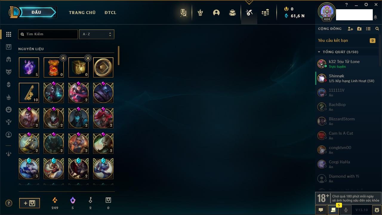 Rank Đơn: Vàng IVKhung: VàngTướng: 171 - Còn 48721 THXTrang Phục: 171Rank ĐTCL: Chưa RankLinh Thú: 27