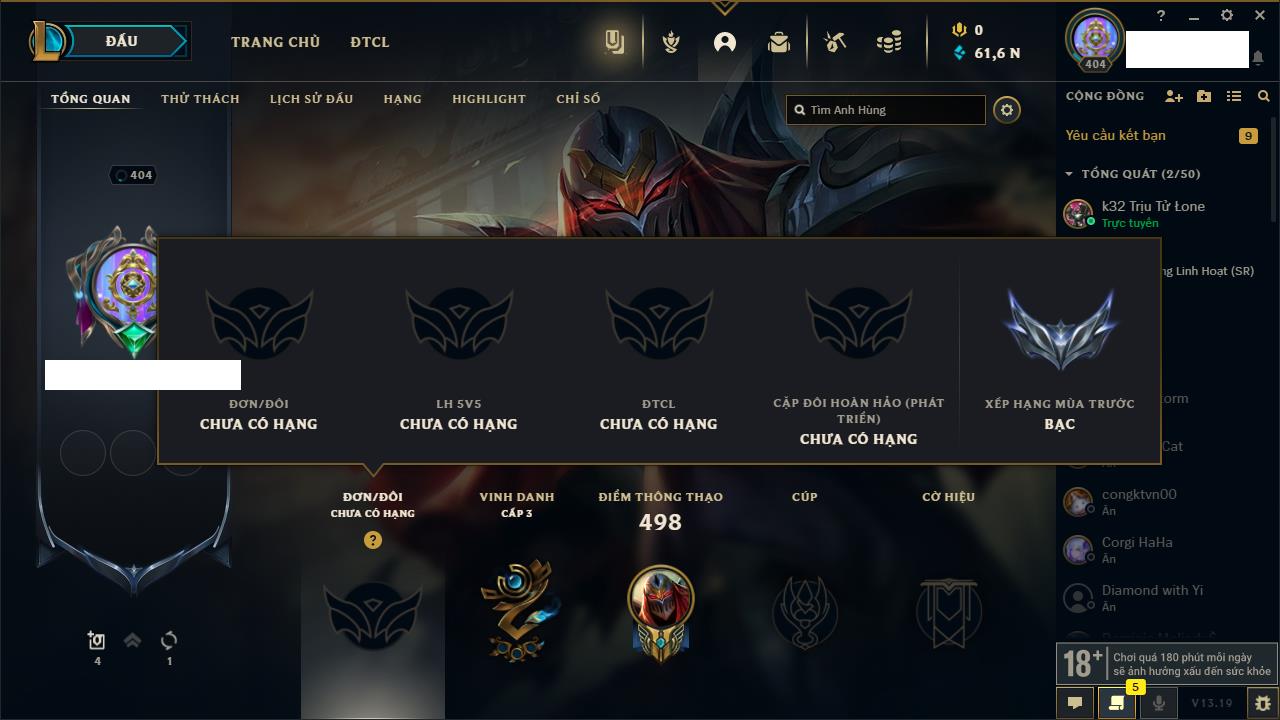 Rank Đơn: Bạc IIKhung: VàngTướng: 171 - Còn 332462 THXTrang Phục: 165Rank ĐTCL: Kim Cương IVLinh Thú: 181