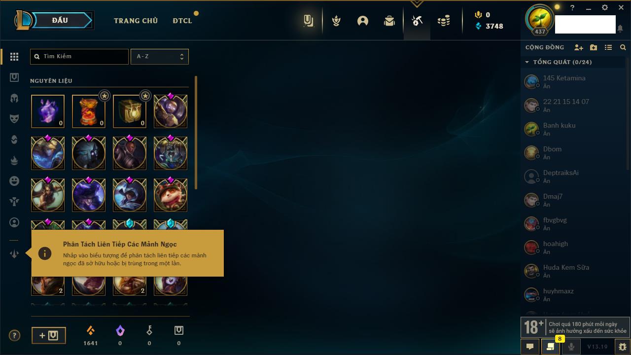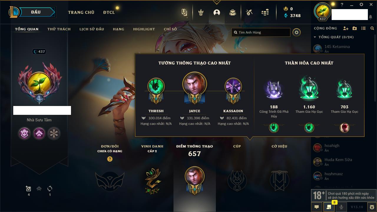 Rank Đơn: Đồng IIKhung: Chưa có khungTướng: 170 - Còn 56487 THXTrang Phục: 90Rank ĐTCL: Chưa RankLinh Thú: 129