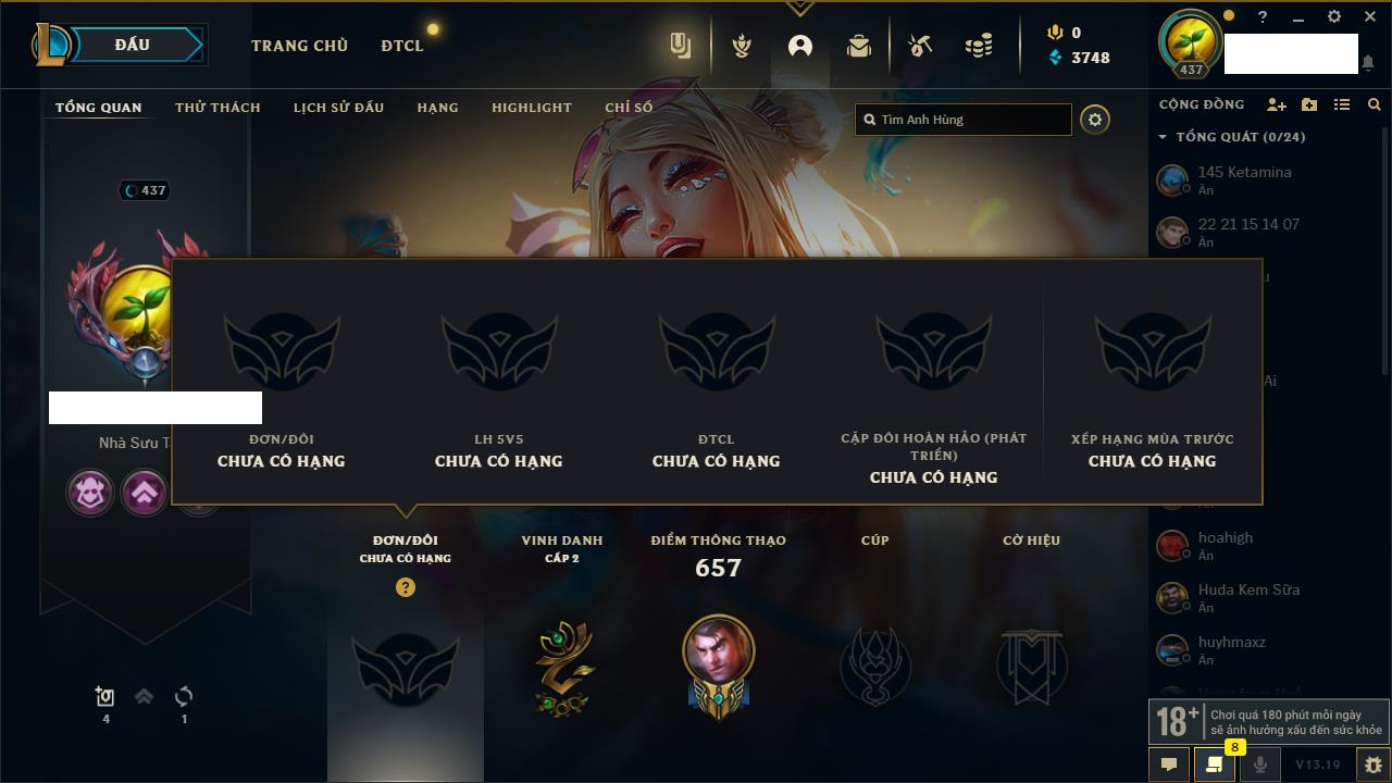 Rank Đơn: Vàng IVKhung: VàngTướng: 146 - Còn 89110 THXTrang Phục: 63Rank ĐTCL: Vàng IIILinh Thú: 41