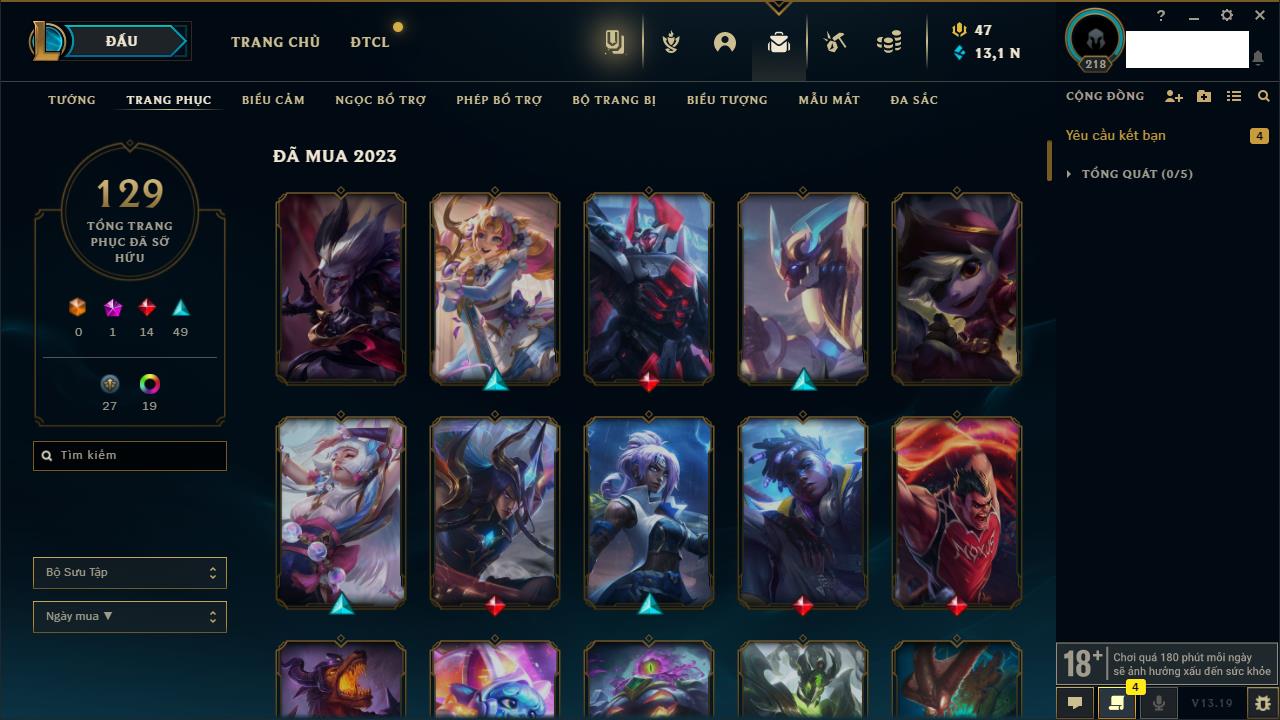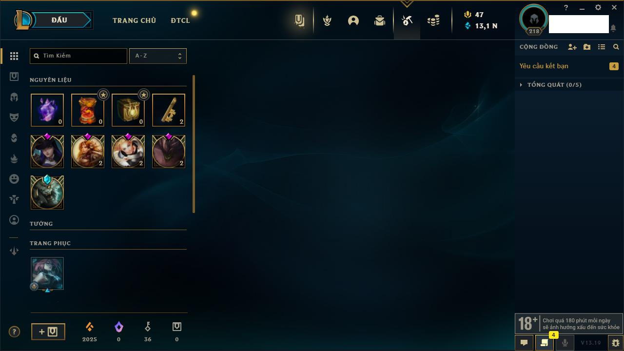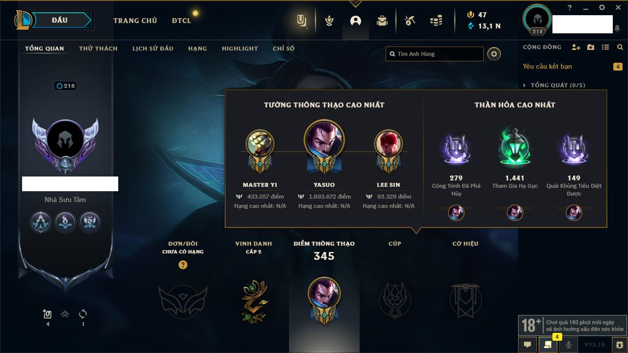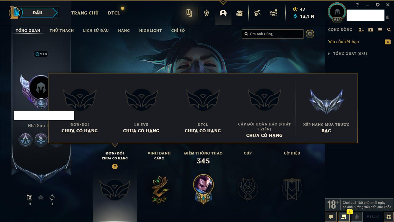 Rank Đơn: Vàng IIIKhung: BạcTướng: 171 - Còn 101359 THXTrang Phục: 88Rank ĐTCL: Kim Cương IVLinh Thú: 200