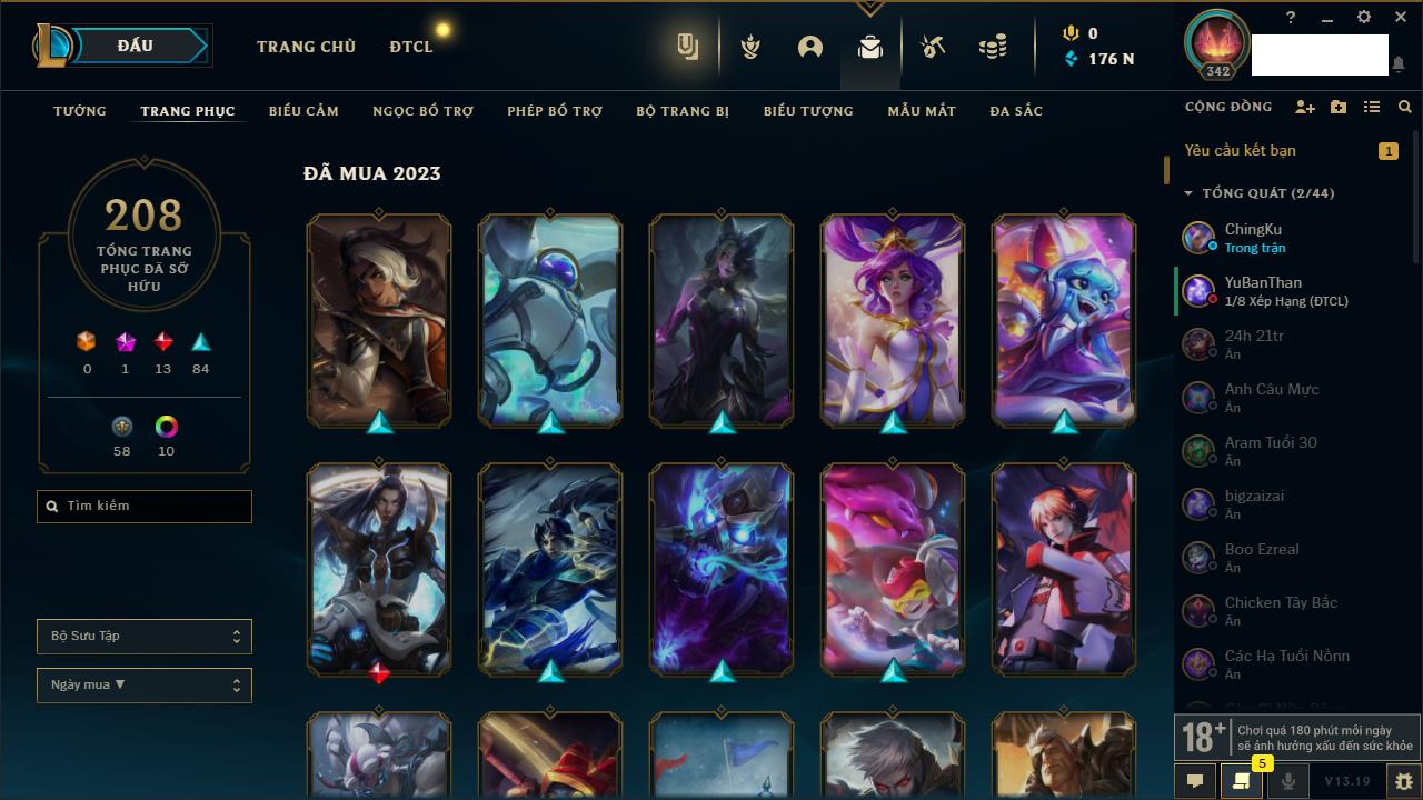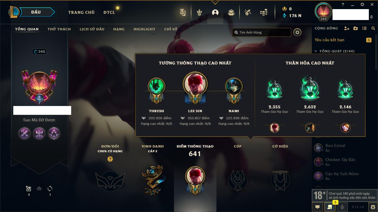Rank Đơn: Vàng IVKhung: VàngTướng: 171 - Còn 48721 THXTrang Phục: 171Rank ĐTCL: Chưa RankLinh Thú: 27