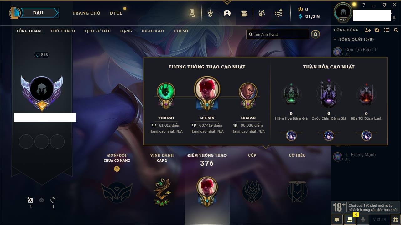 Rank Đơn: Vàng IVKhung: BạcTướng: 166 - Còn 180925 THXTrang Phục: 163Rank ĐTCL: Chưa RankLinh Thú: 67