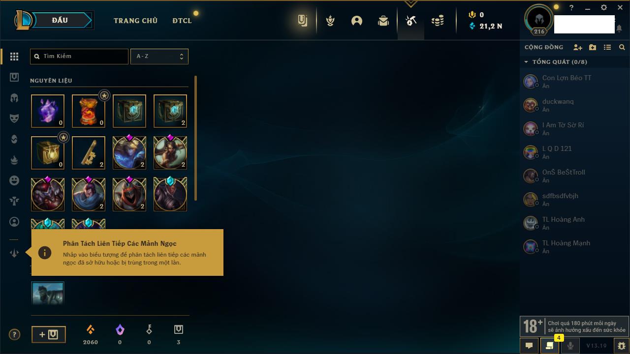 Rank Đơn: Vàng IVKhung: BạcTướng: 171 - Còn 231097 THXTrang Phục: 180Rank ĐTCL: Vàng IVLinh Thú: 110