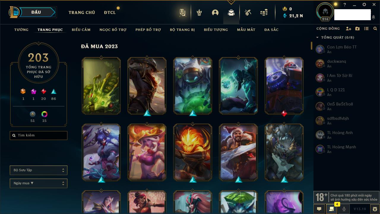 Rank Đơn: Vàng IVKhung: VàngTướng: 171 - Còn 48721 THXTrang Phục: 171Rank ĐTCL: Chưa RankLinh Thú: 27