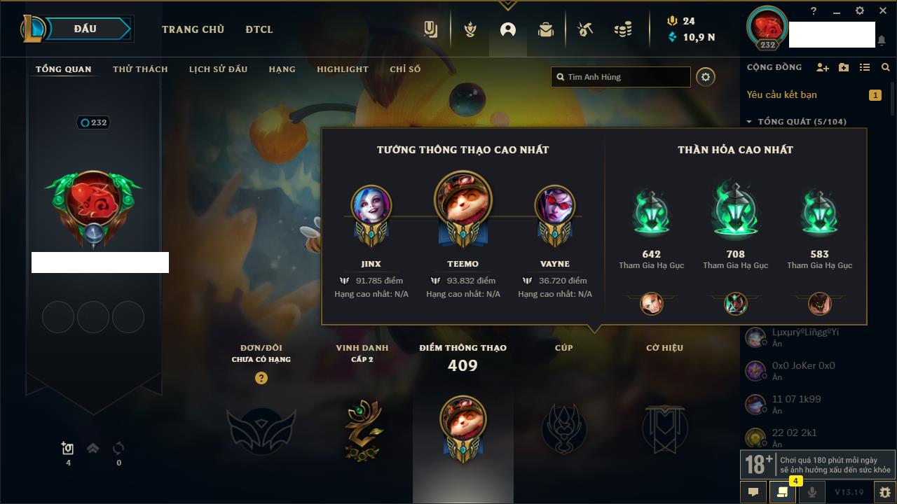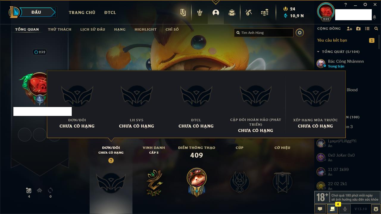 Rank Đơn: Bạc IKhung: BạcTướng: 170 - Còn 110919 THXTrang Phục: 253Rank ĐTCL: Chưa RankLinh Thú: 173