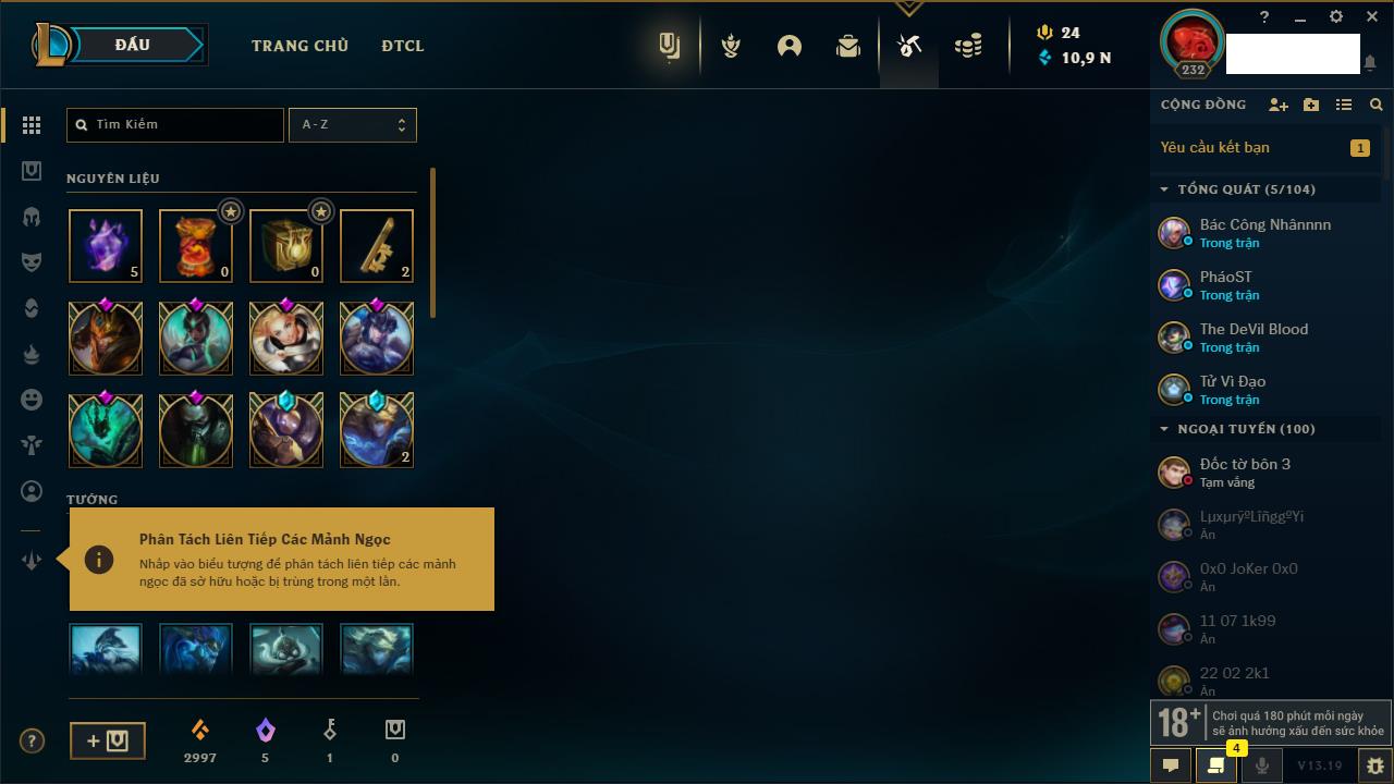 Rank Đơn: Vàng IIIKhung: Chưa có khungTướng: 171 - Còn 79750 THXTrang Phục: 288Rank ĐTCL: Chưa RankLinh Thú: 79