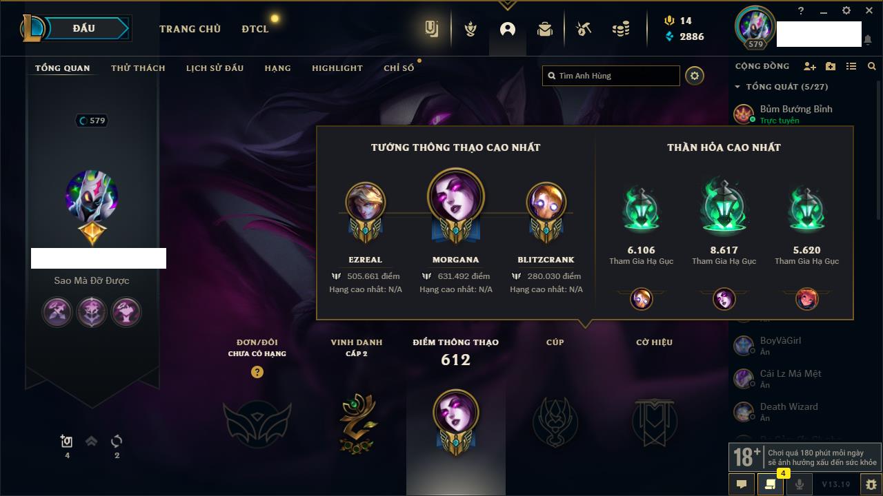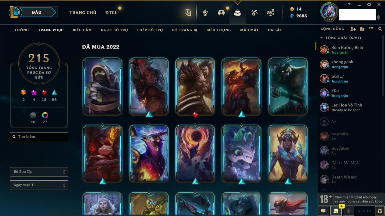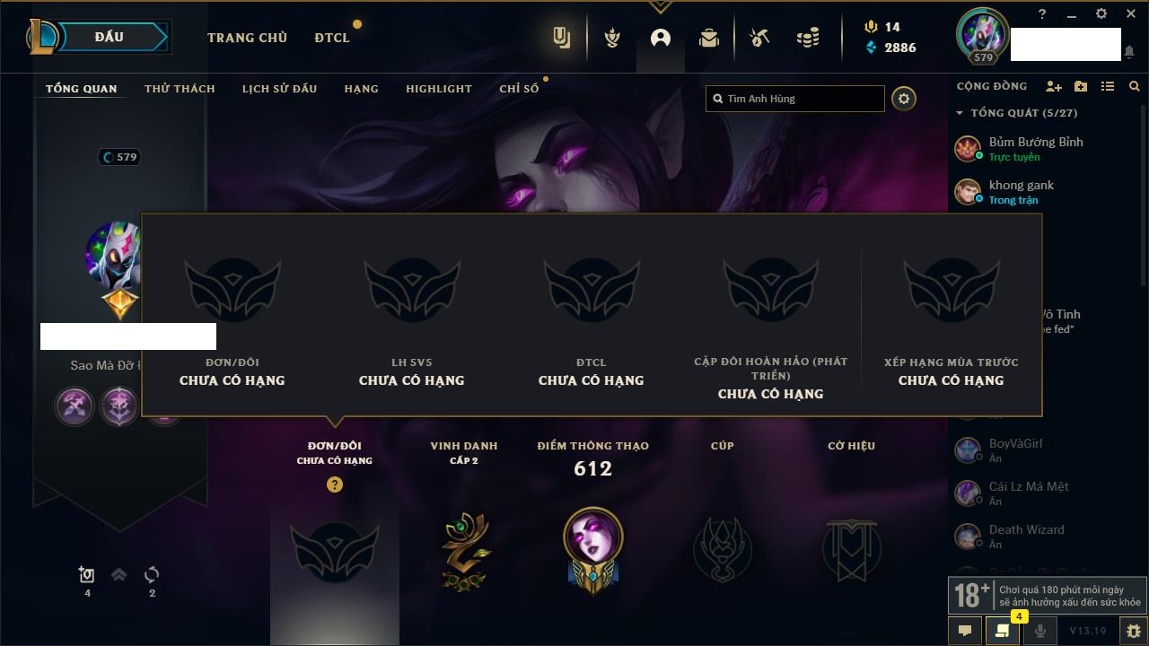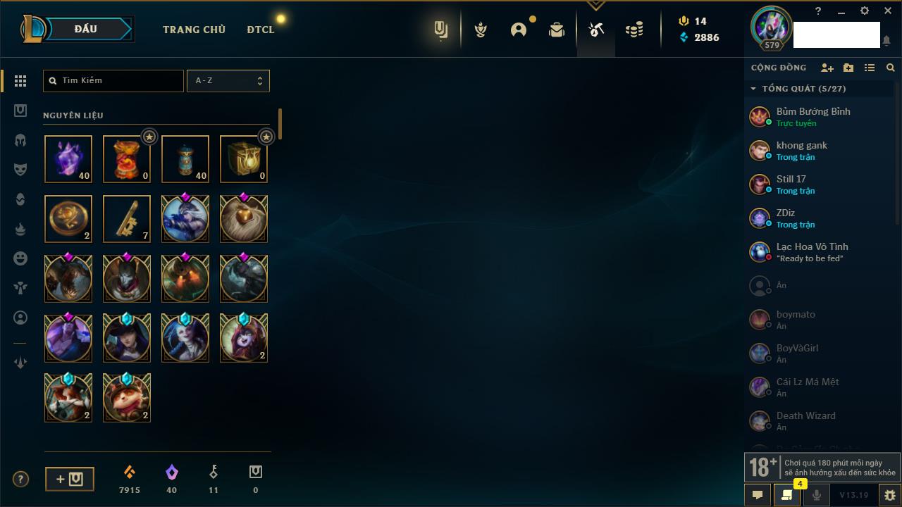 Rank Đơn: Vàng IIIKhung: BạcTướng: 171 - Còn 101359 THXTrang Phục: 88Rank ĐTCL: Kim Cương IVLinh Thú: 200