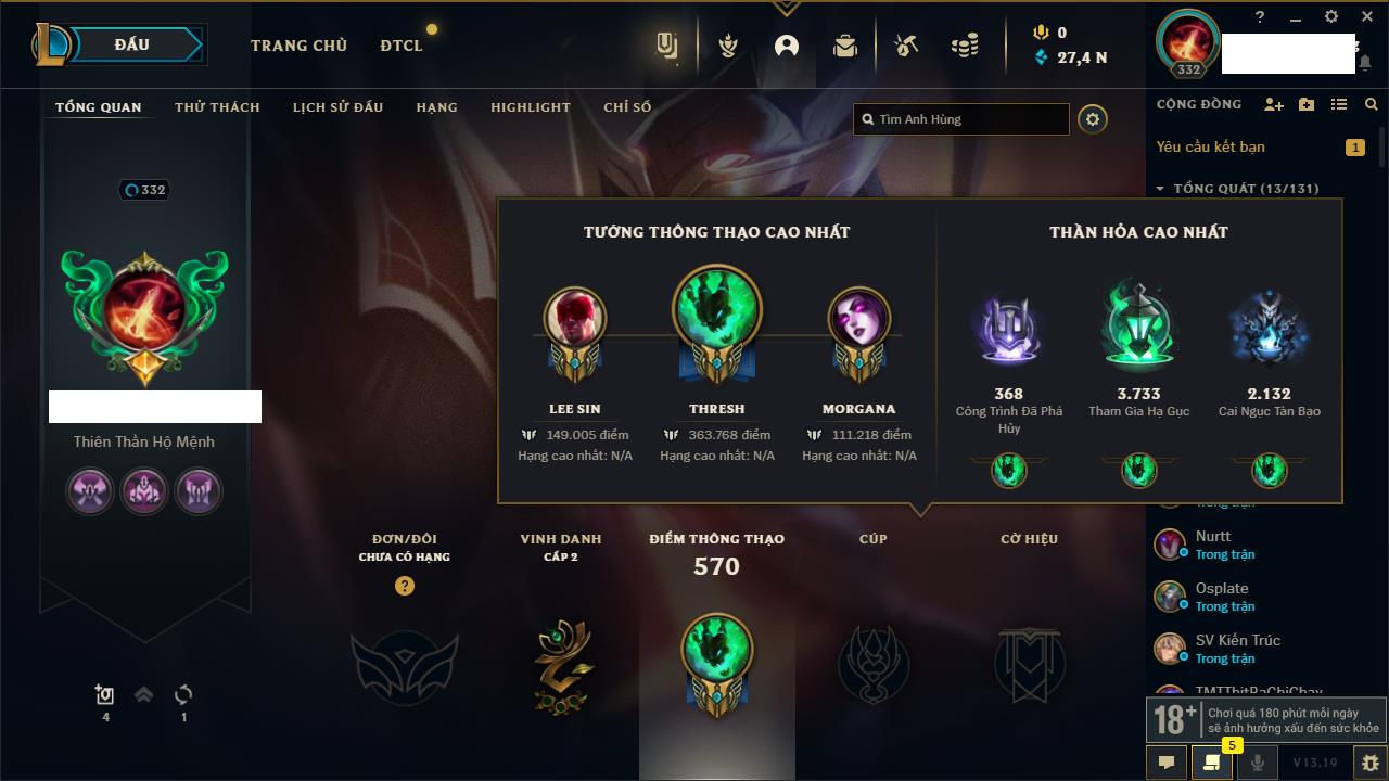 Rank Đơn: Bạc IKhung: BạcTướng: 170 - Còn 110919 THXTrang Phục: 253Rank ĐTCL: Chưa RankLinh Thú: 173