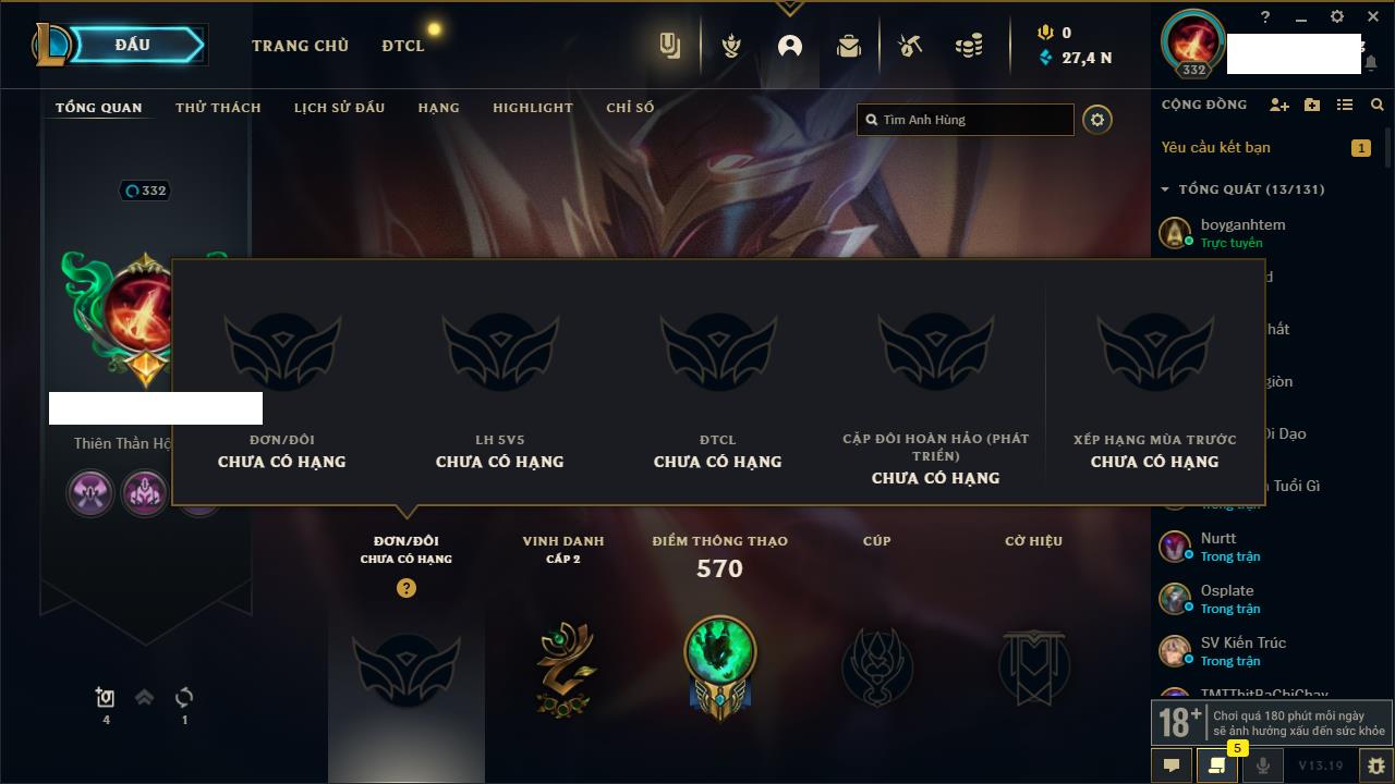 Rank Đơn: Vàng IIIKhung: Chưa có khungTướng: 171 - Còn 79750 THXTrang Phục: 288Rank ĐTCL: Chưa RankLinh Thú: 79