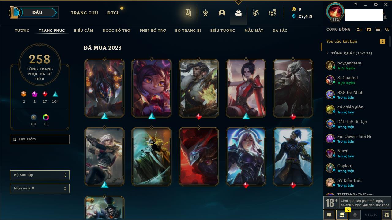 Rank Đơn: Bạc IIIKhung: BạcTướng: 170 - Còn 42417 THXTrang Phục: 262Rank ĐTCL: Chưa RankLinh Thú: 132