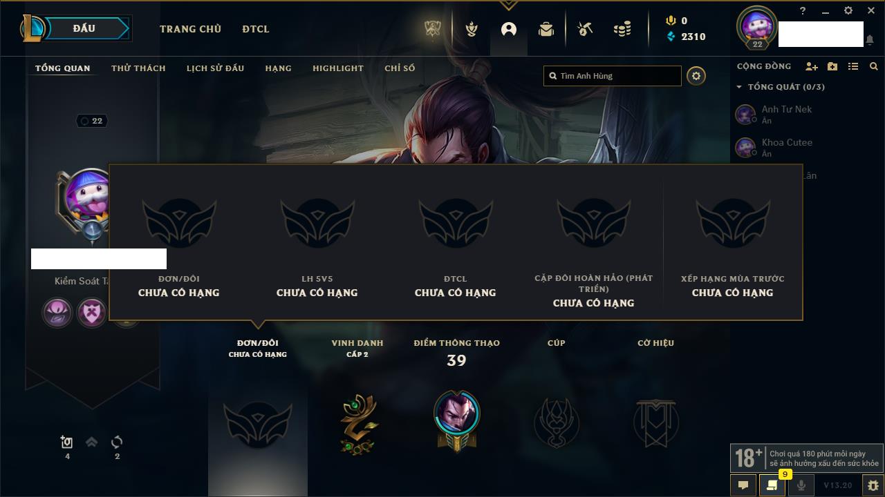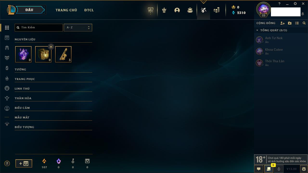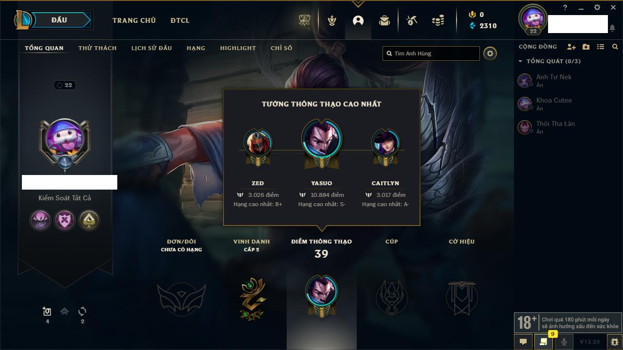 Rank Đơn: Chưa rank mùa nàoKhung: Chưa có khungTướng: 156 - Còn 18550 THXTrang Phục: 4Rank ĐTCL: Chưa RankLinh Thú: 75