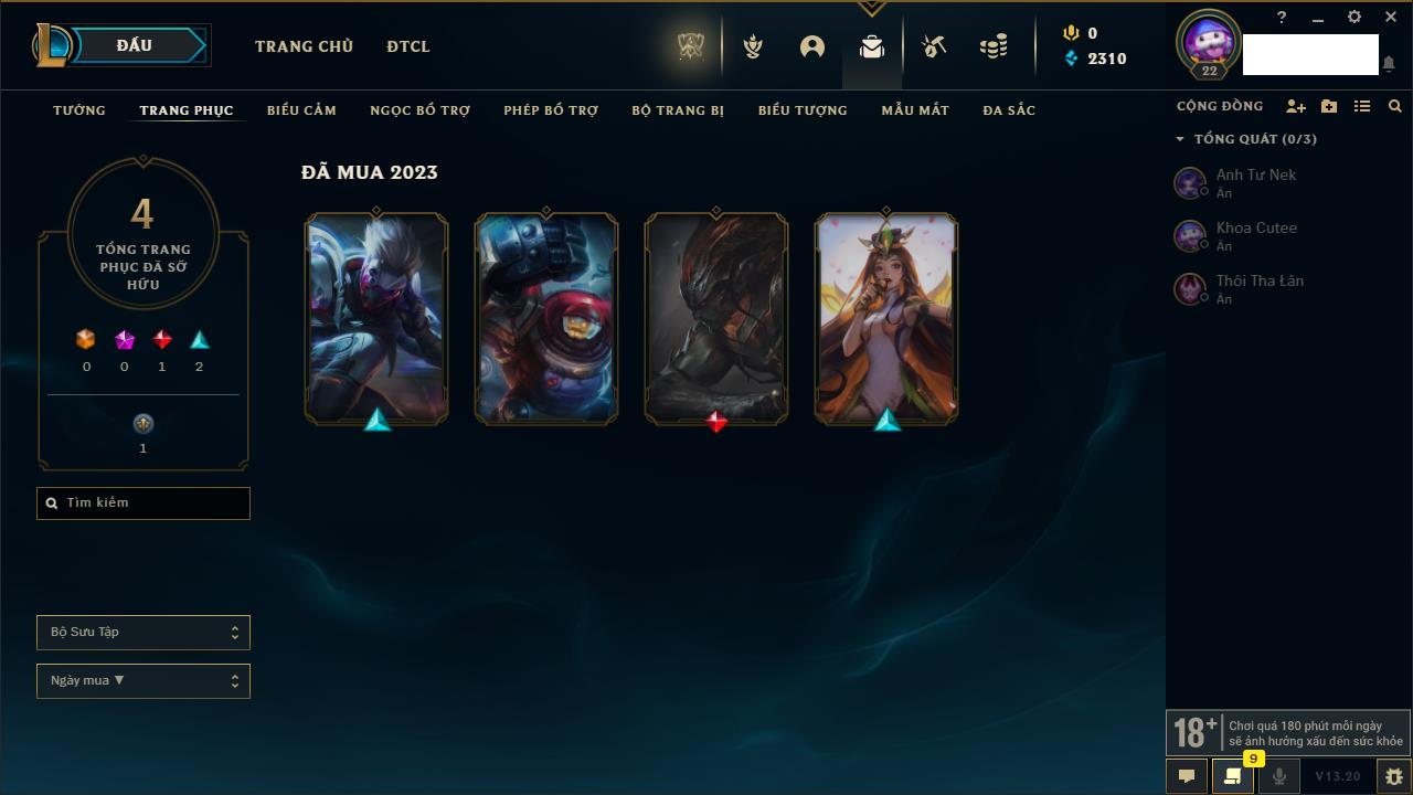 Rank Đơn: Chưa rank mùa nàoKhung: Chưa có khungTướng: 157 - Còn 8409 THXTrang Phục: 12Rank ĐTCL: Chưa RankLinh Thú: 74