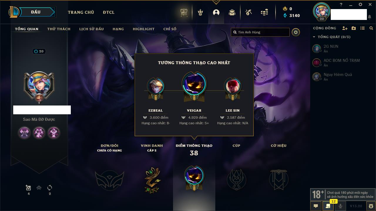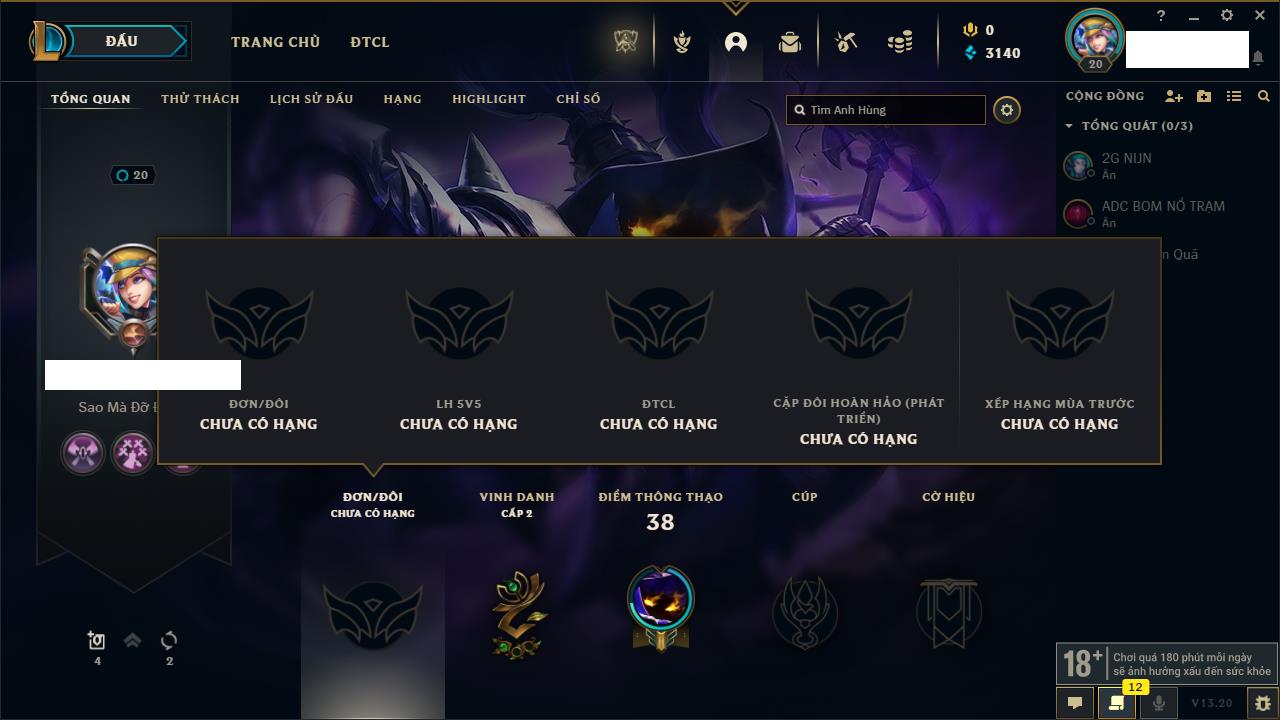 Rank Đơn: Chưa rank mùa nàoKhung: Chưa có khungTướng: 2 - Còn 8000 THXTrang Phục: 0Rank ĐTCL: Chưa RankLinh Thú: 38
