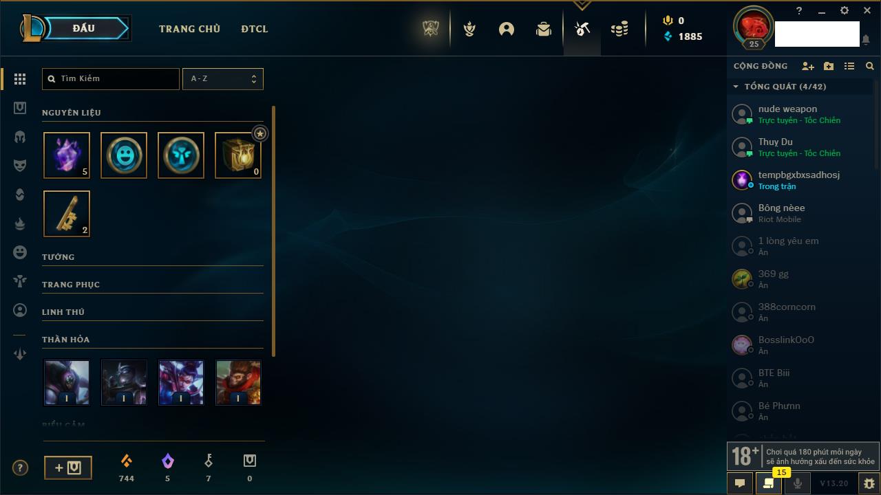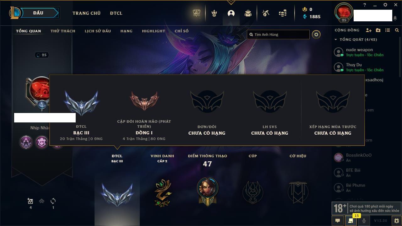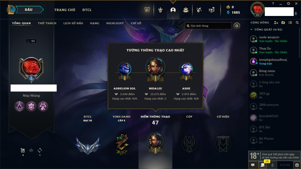 Rank Đơn: Chưa rank mùa nàoKhung: Chưa có khungTướng: 156 - Còn 18550 THXTrang Phục: 4Rank ĐTCL: Chưa RankLinh Thú: 75