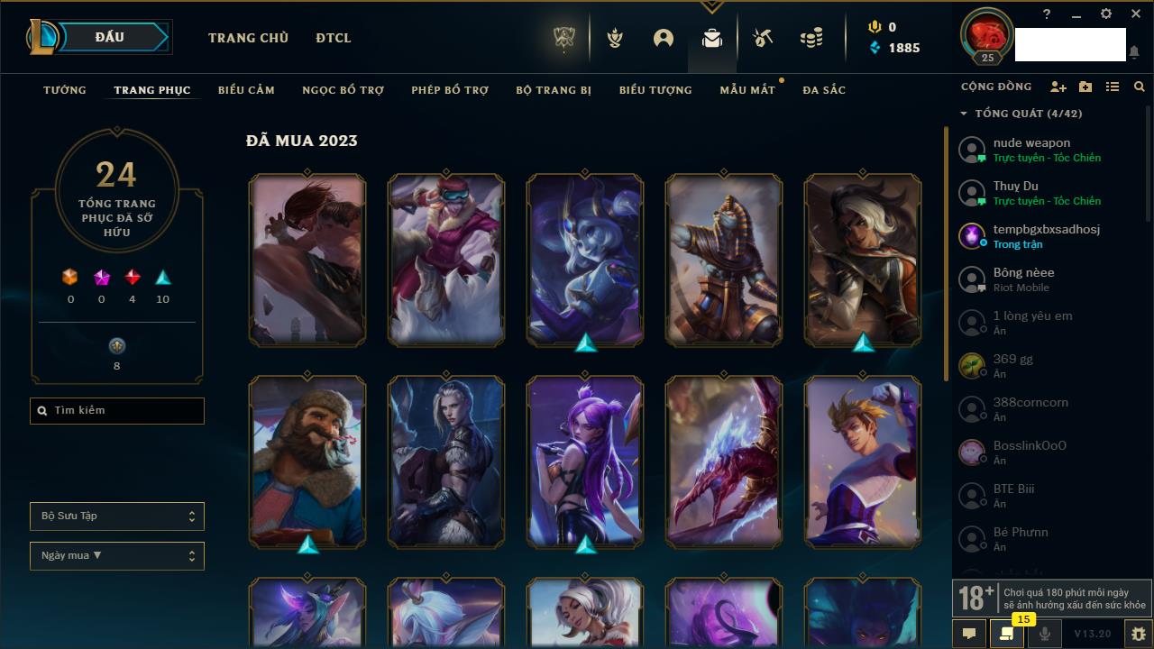 Rank Đơn: Chưa rank mùa nàoKhung: Chưa có khungTướng: 161 - Còn 11380 THXTrang Phục: 13Rank ĐTCL: Chưa RankLinh Thú: 74