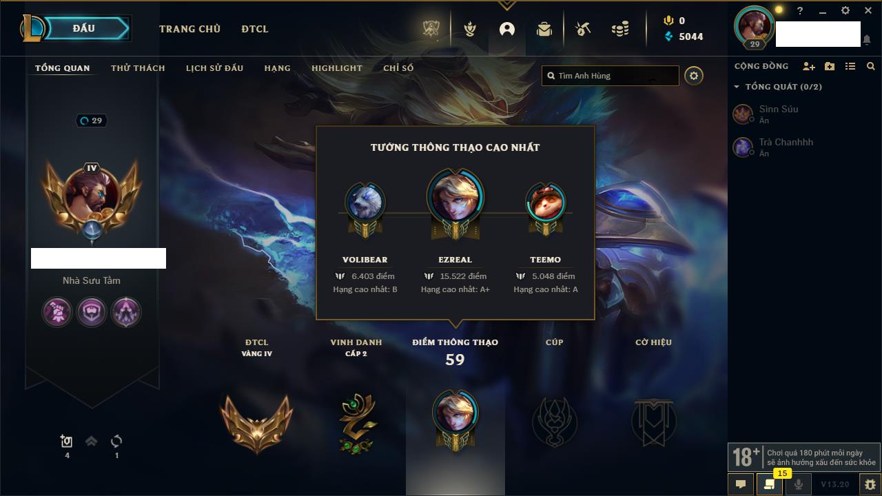 Rank Đơn: Chưa rank mùa nàoKhung: Chưa có khungTướng: 12 - Còn 3853 THXTrang Phục: 2Rank ĐTCL: Chưa RankLinh Thú: 30